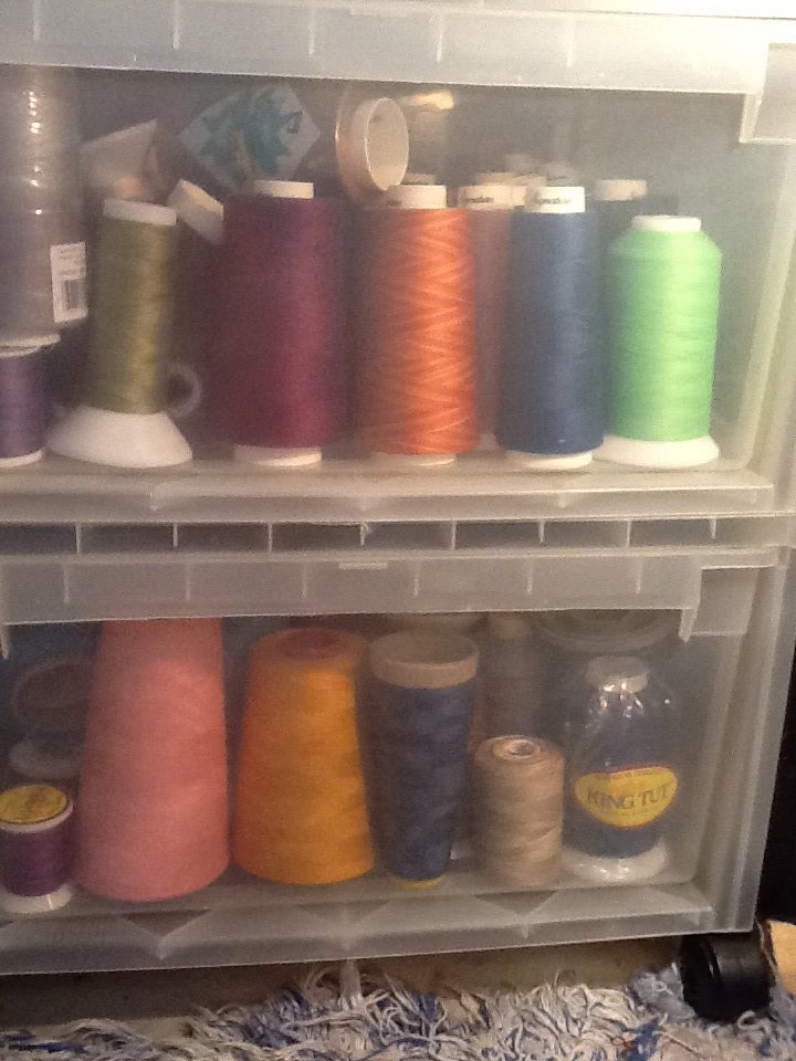 Tip #2 – Keep threads out of the light and covered. This prevents fading and dust! My Longarm threads live in a roller plastic drawer unit and my small spools live in old “Hot Wheels” plastic boxes and a “real” Sulky spool organizer box.