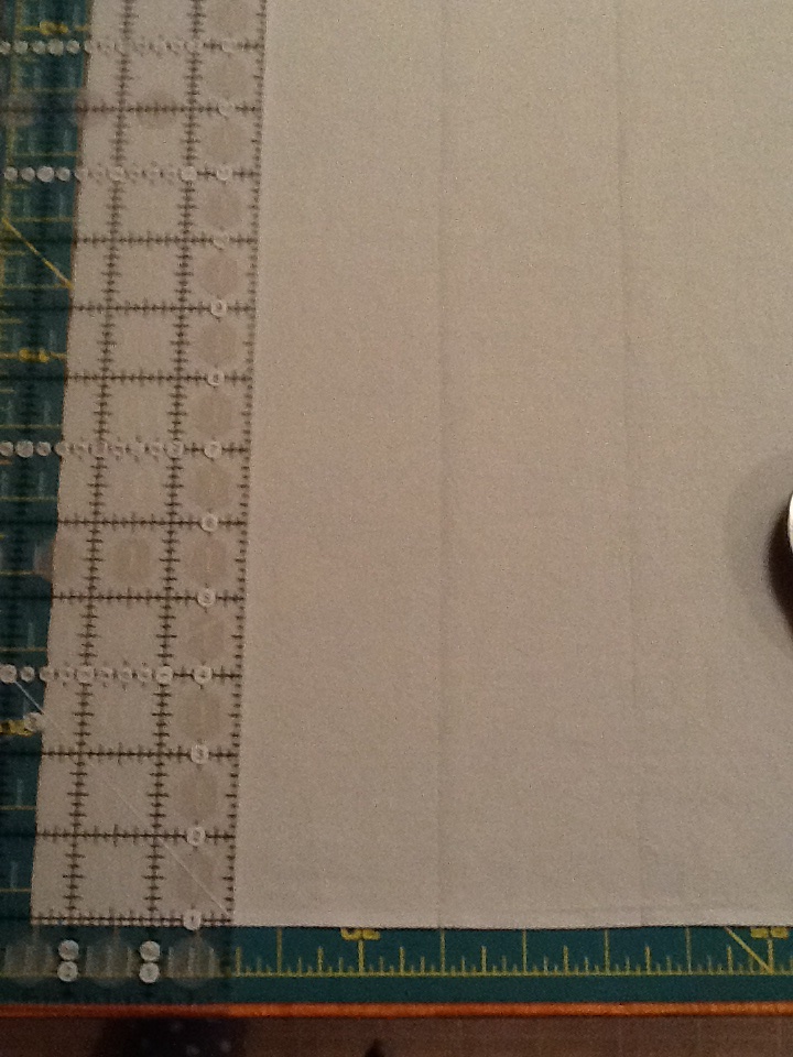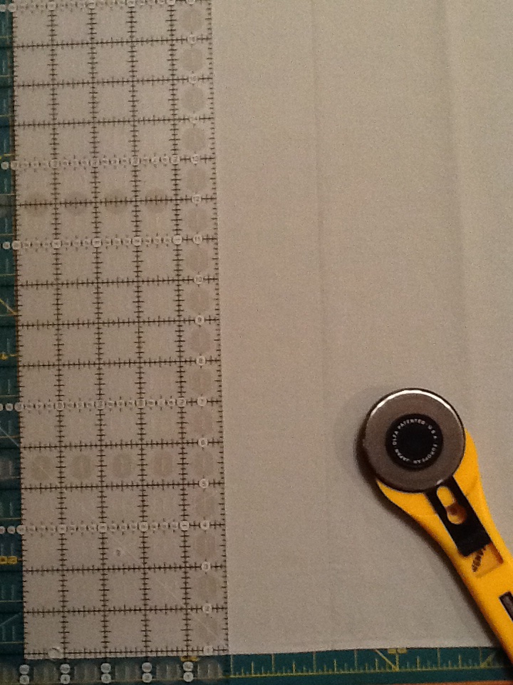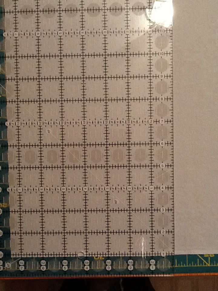 At the getaway I was cutting many, many strips for a project.  Do you have a method for speeding up the process?  Instead of cutting one strip at a time and removing it and then cutting the next, try cutting several before removing.  I straighten one edge and then move my ruler to the furthest measurement I can cut.  3 x 2 1/2″ = 7 1/2″. I move my ruler to 7 1/2″, make a cut, move to 5″, cut and finally to 2 1/2″ and cut.  This helps me save time with fewer movements.  I’ve shown this in the photos below.  Notice the cut line.  It is very faint as I leave it in place until I’ve made all three cuts.