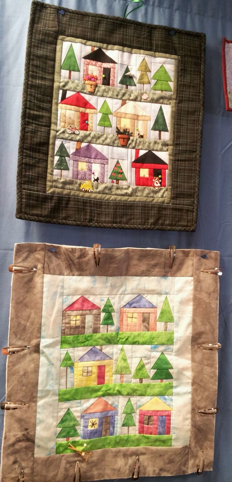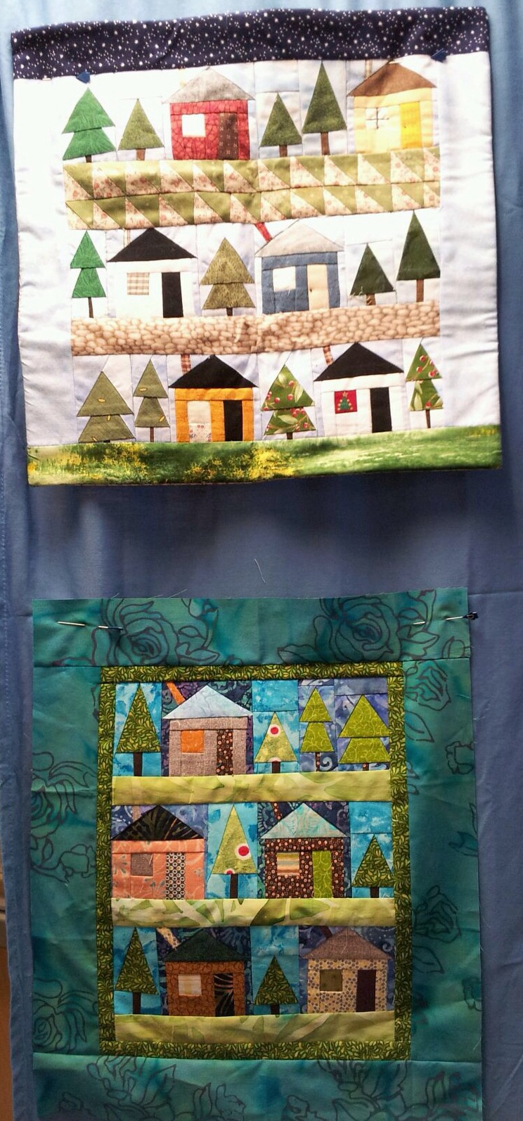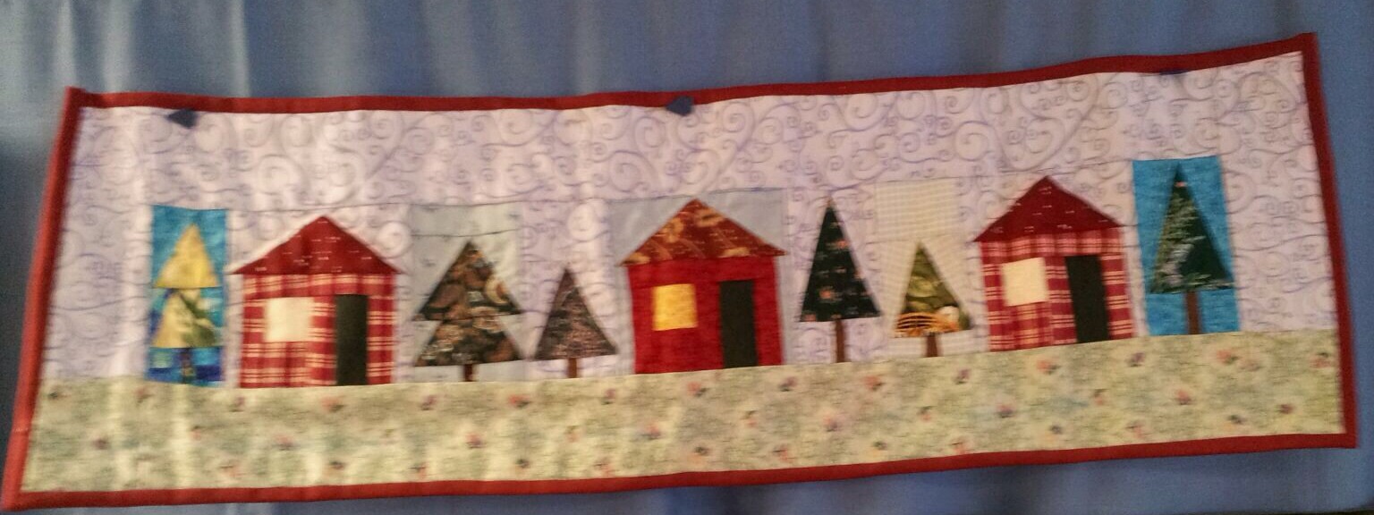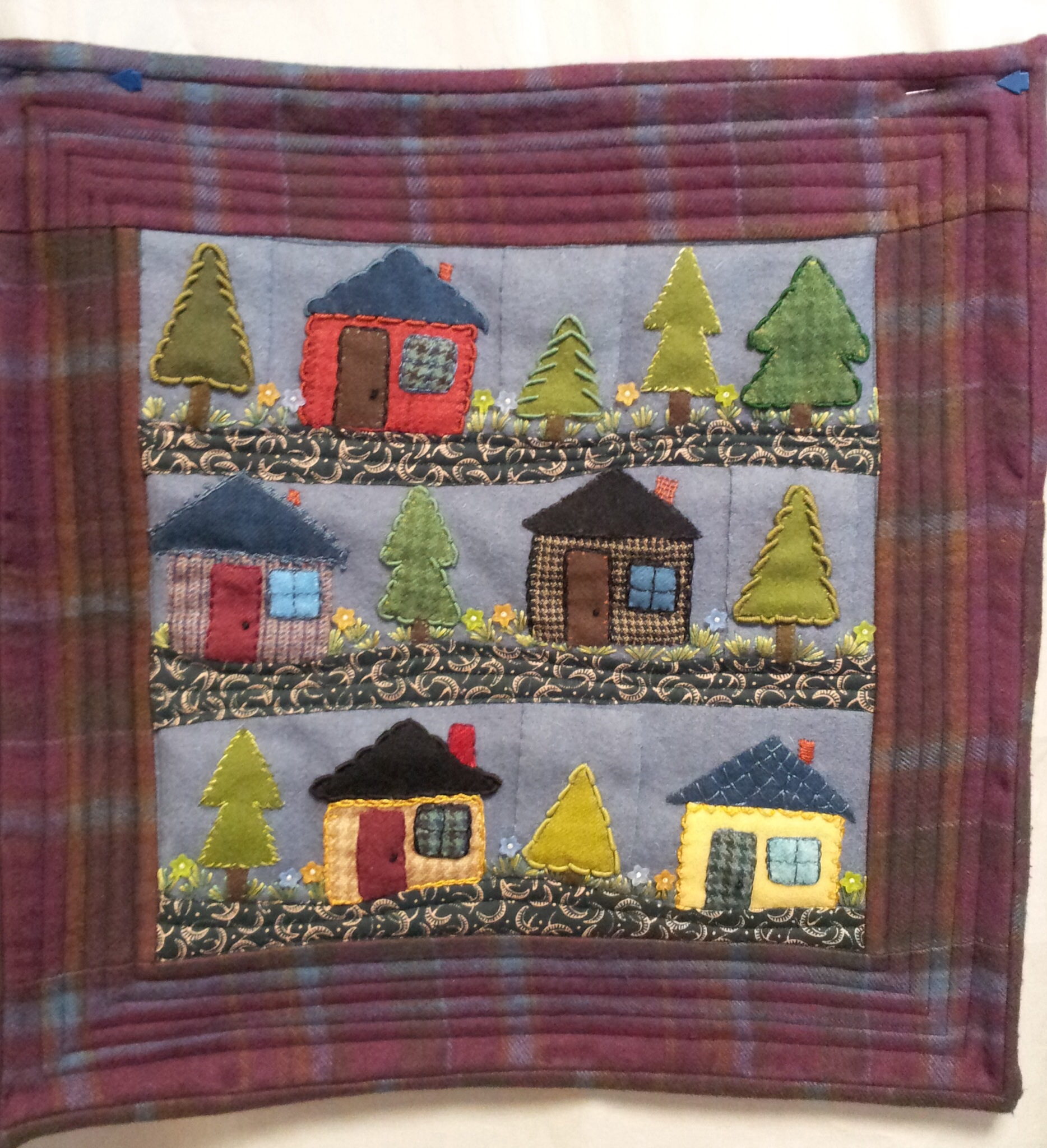 One of the guilds I belong to, Blackstone Valley Heritage Quilters, does not meet in the summer. So, this time of year all the year long projects are due. A couple weeks ago, I showed the Half Square Heyday challenge quilts. Last week our Block of the Month projects were due. I was the chair for the BOM and I want to share the quilts. The theme was “What a Wonderful World” with piecing on a muslin foundation. I had stamps made using blocks from the Electric Quilt program. AND I made them miniature!! LITTLE 3″ houses and a variety of trees were stamped and given out each month. The final layout was presented but they were free to arrange as they like. My LITTLE Wonderful World is below! (Before quilting)
