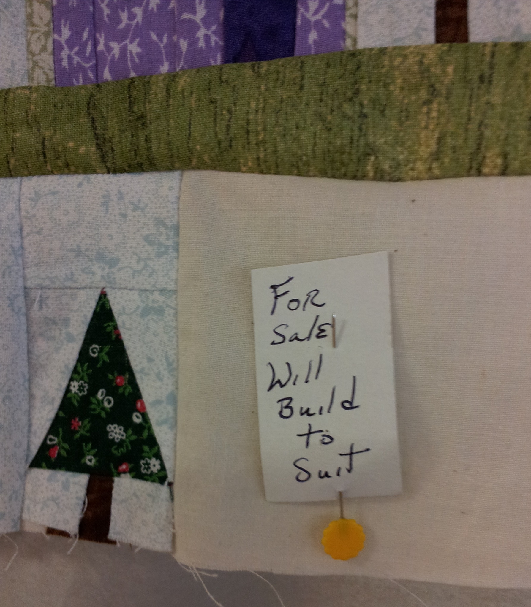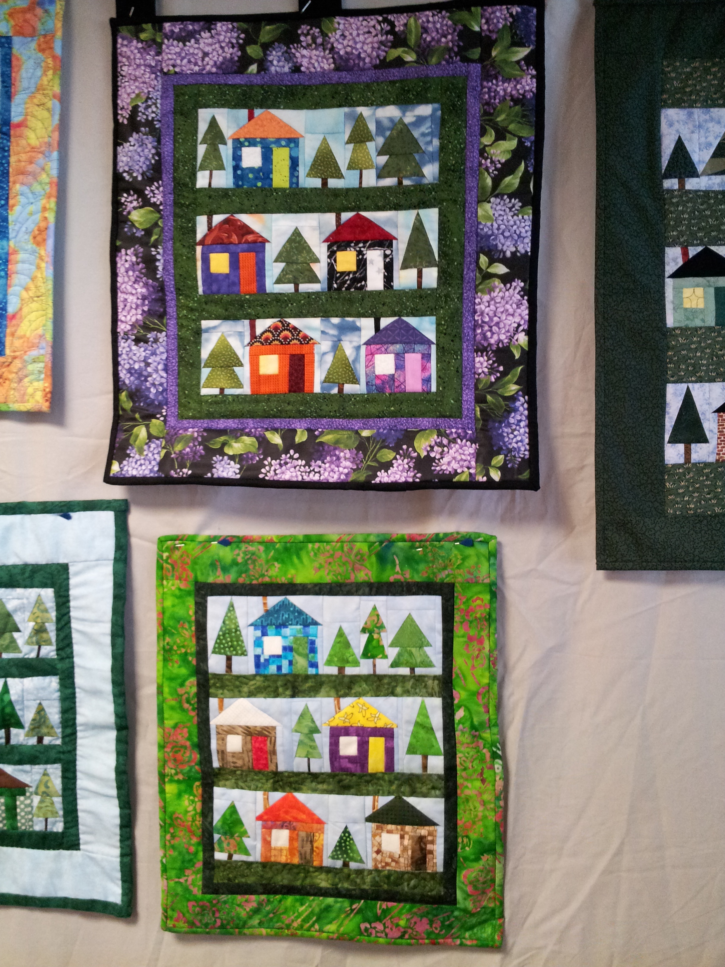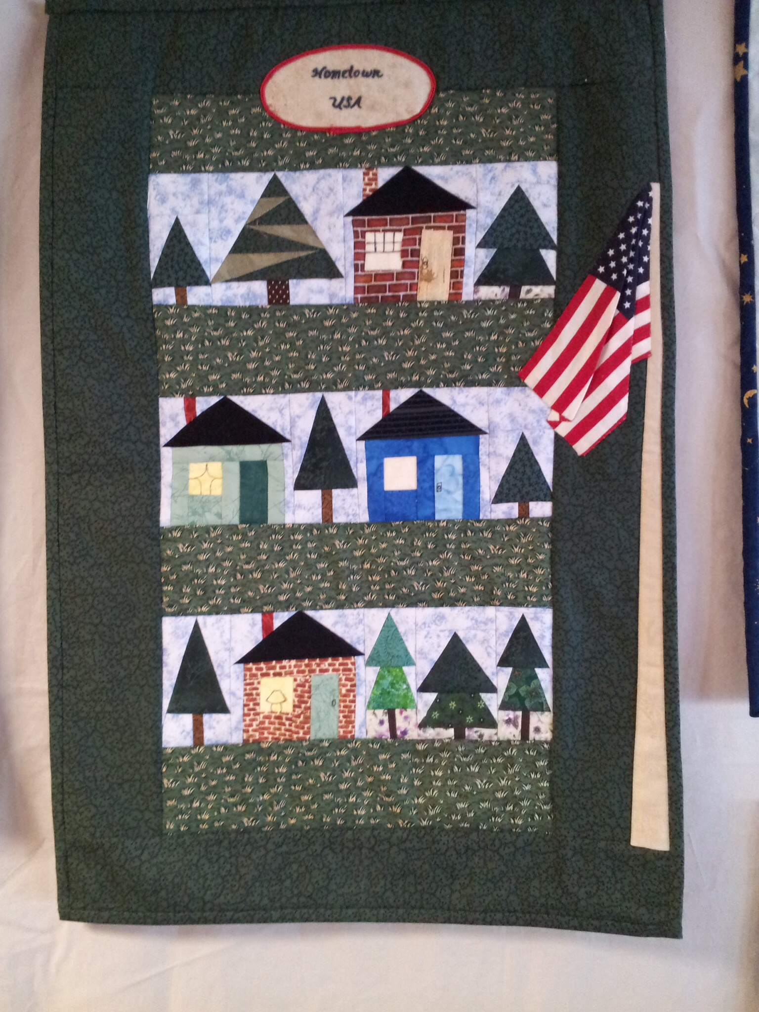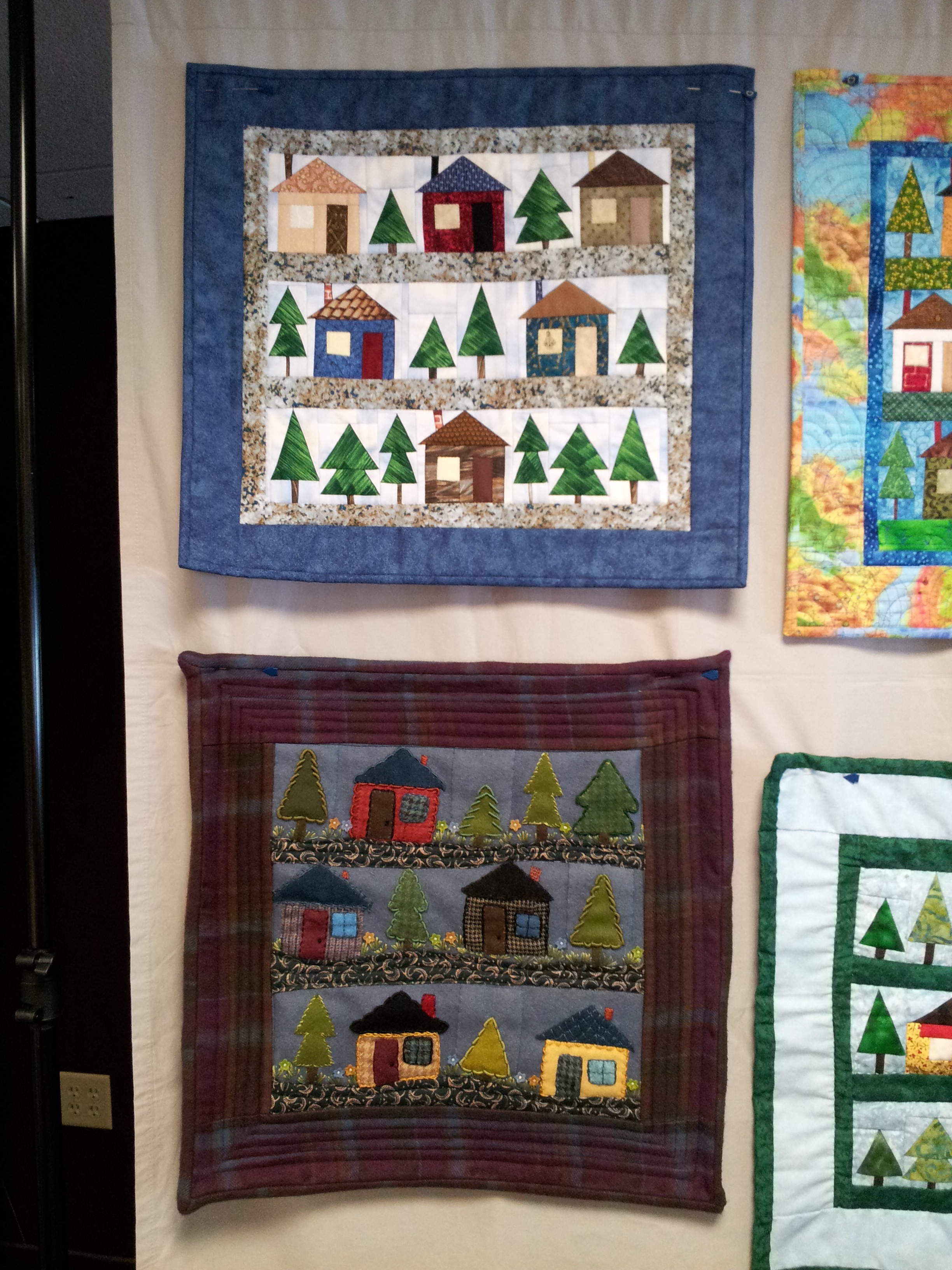 One of the guilds I belong to, Blackstone Valley Heritage Quilters, does not meet in the summer. So, this time of year all the year long projects are due. A couple weeks ago, I showed the Half Square Heyday challenge quilts. Last week our Block of the Month projects were due. I was the chair for the BOM and I want to share the quilts. The theme was “What a Wonderful World” with piecing on a muslin foundation. I had stamps made using blocks from the Electric Quilt program. AND I made them miniature!! LITTLE 3″ houses and a variety of trees were stamped and given out each month. The final layout was presented but they were free to arrange as they like. My LITTLE Wonderful World is below! (Before quilting)