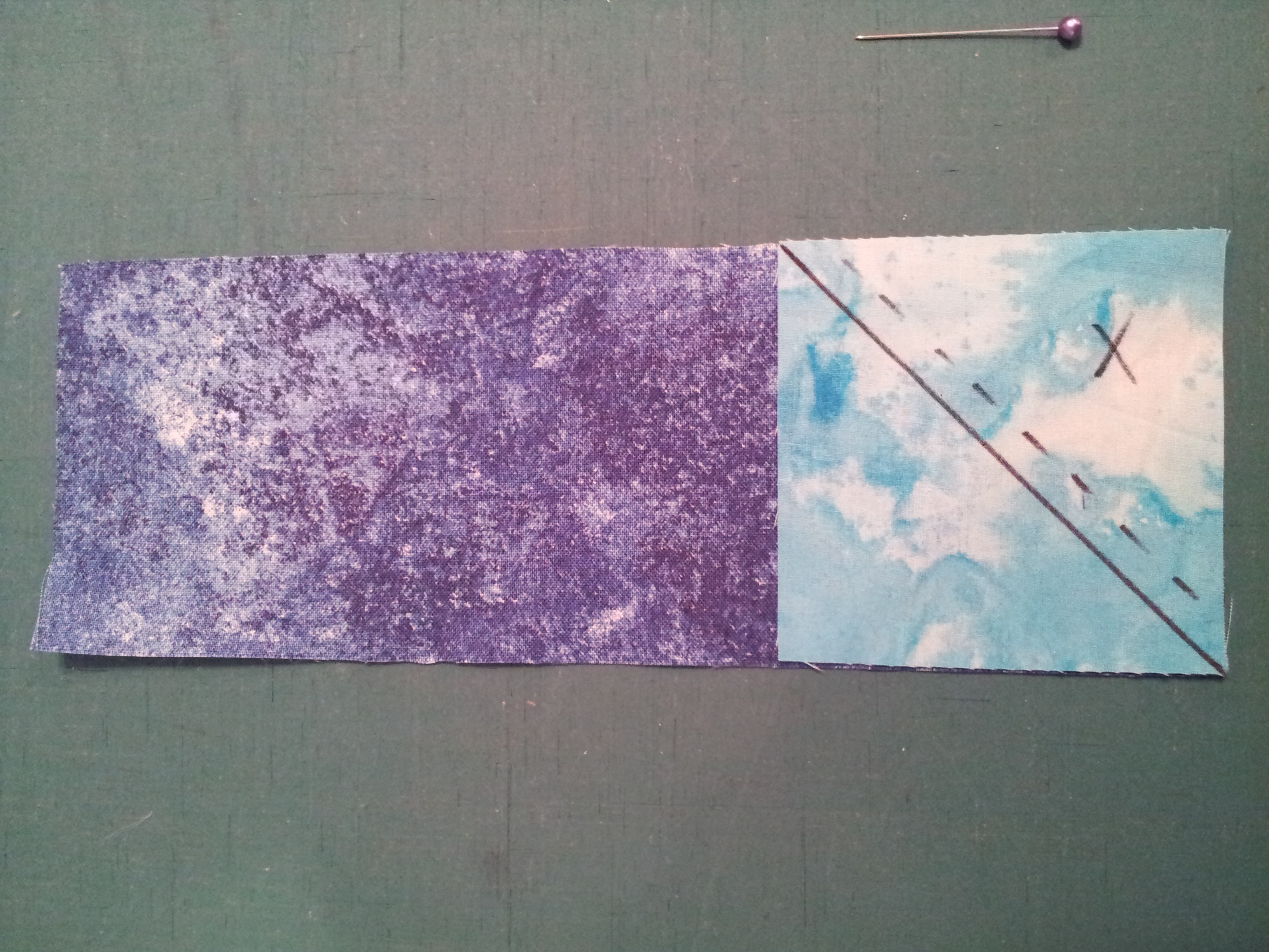 - the sewing line is the solid line and dotted line is seam allowance to be cut away, X is scrap (often waste and not used). (X is too small to use on another rectangle)