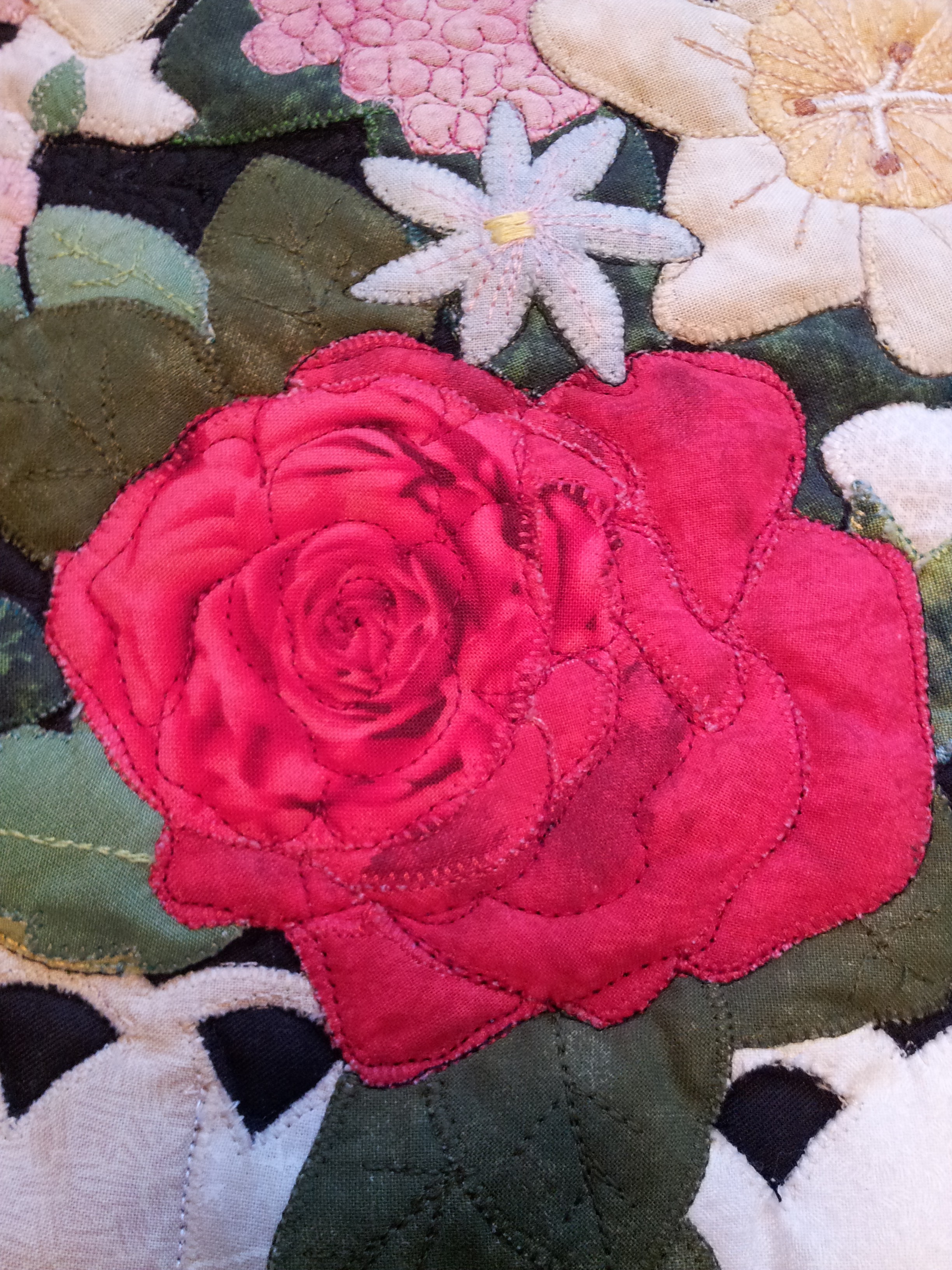 Elaine Nadeau’s beautiful quilt is raw edge fused applique and I quilted it!
