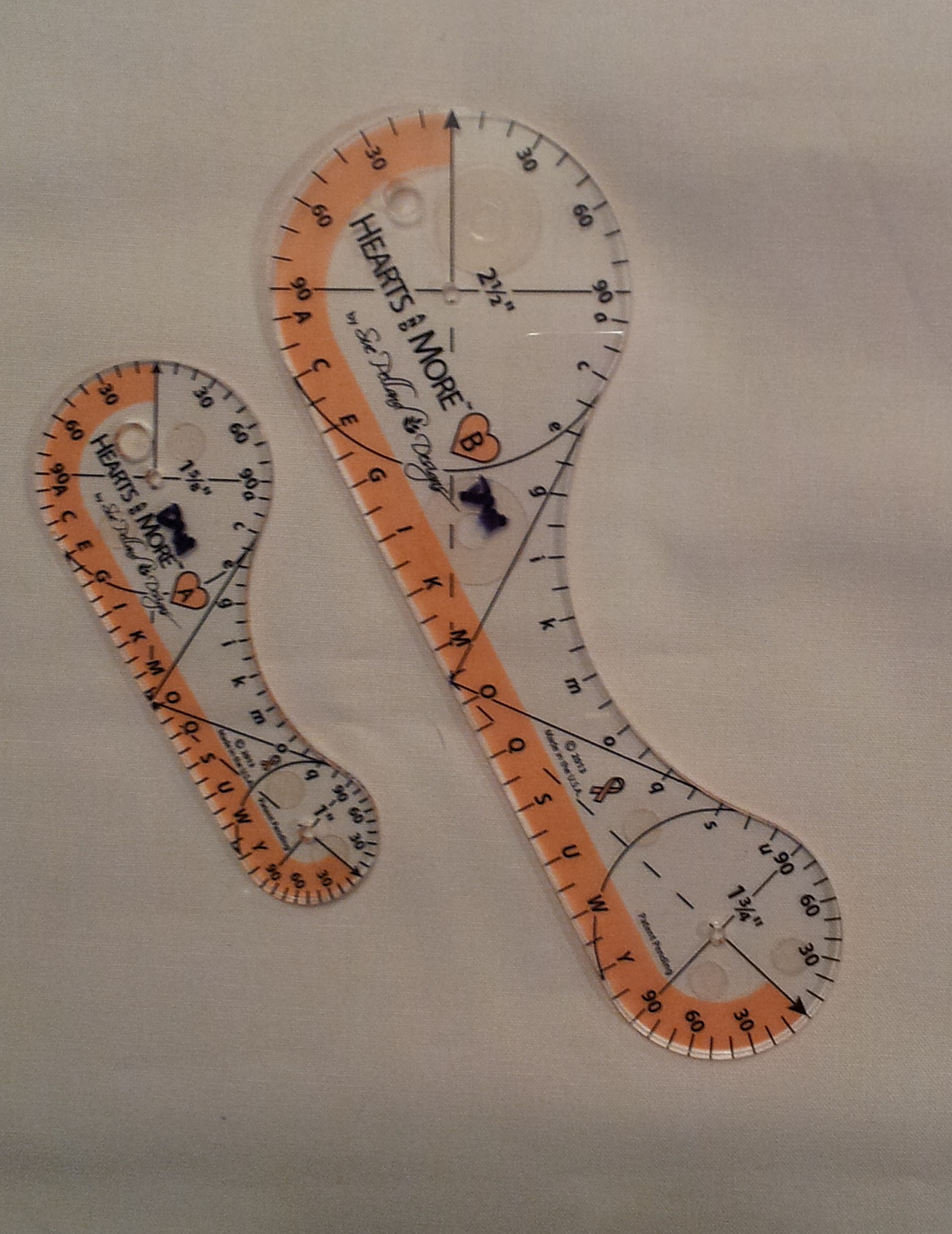 Another ruler…rulers for cutting circles (and other shapes) is Sue Pelland’s Hearts and More. The photo is some shapes I made in a workshop I took from Sue.