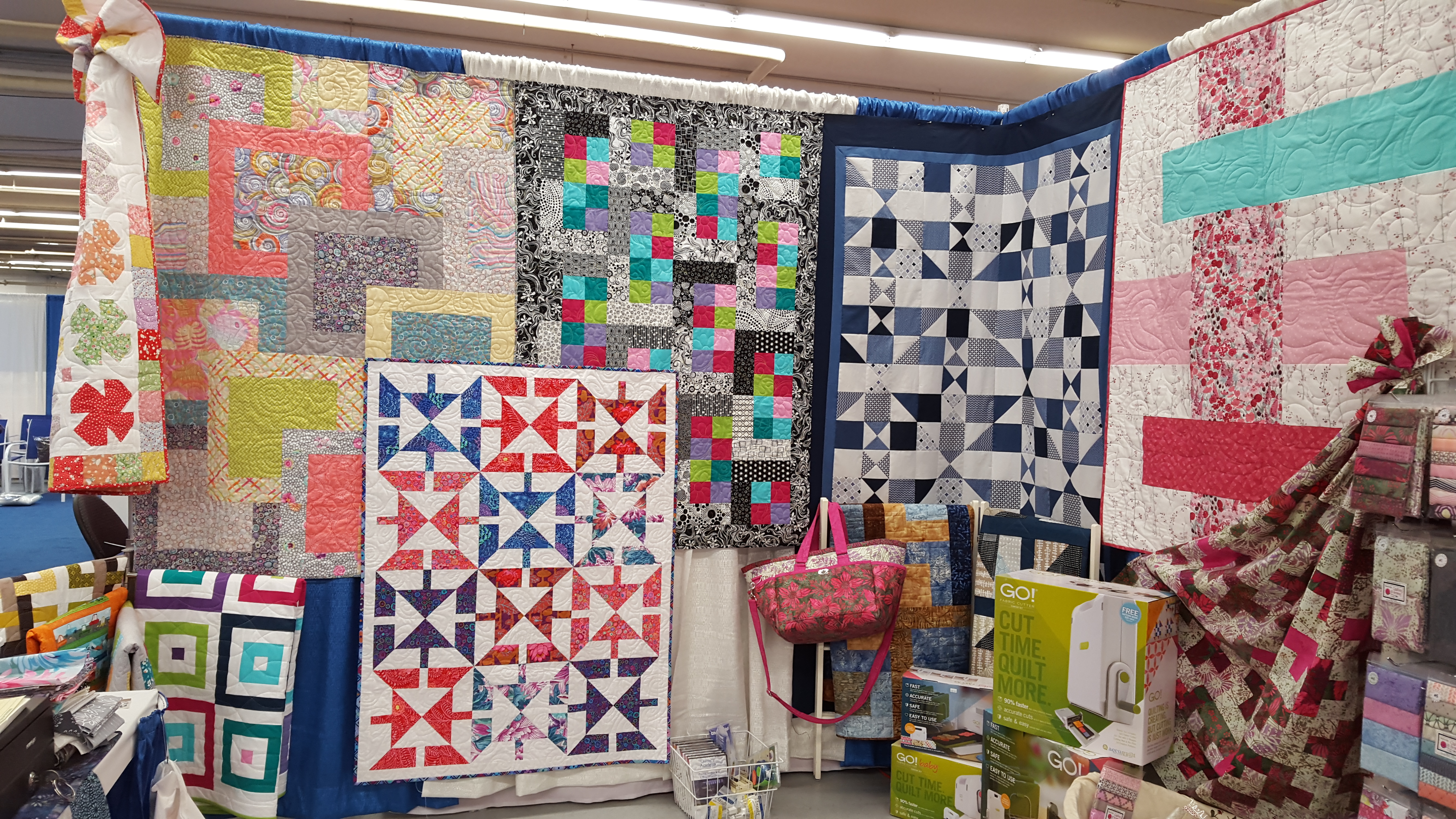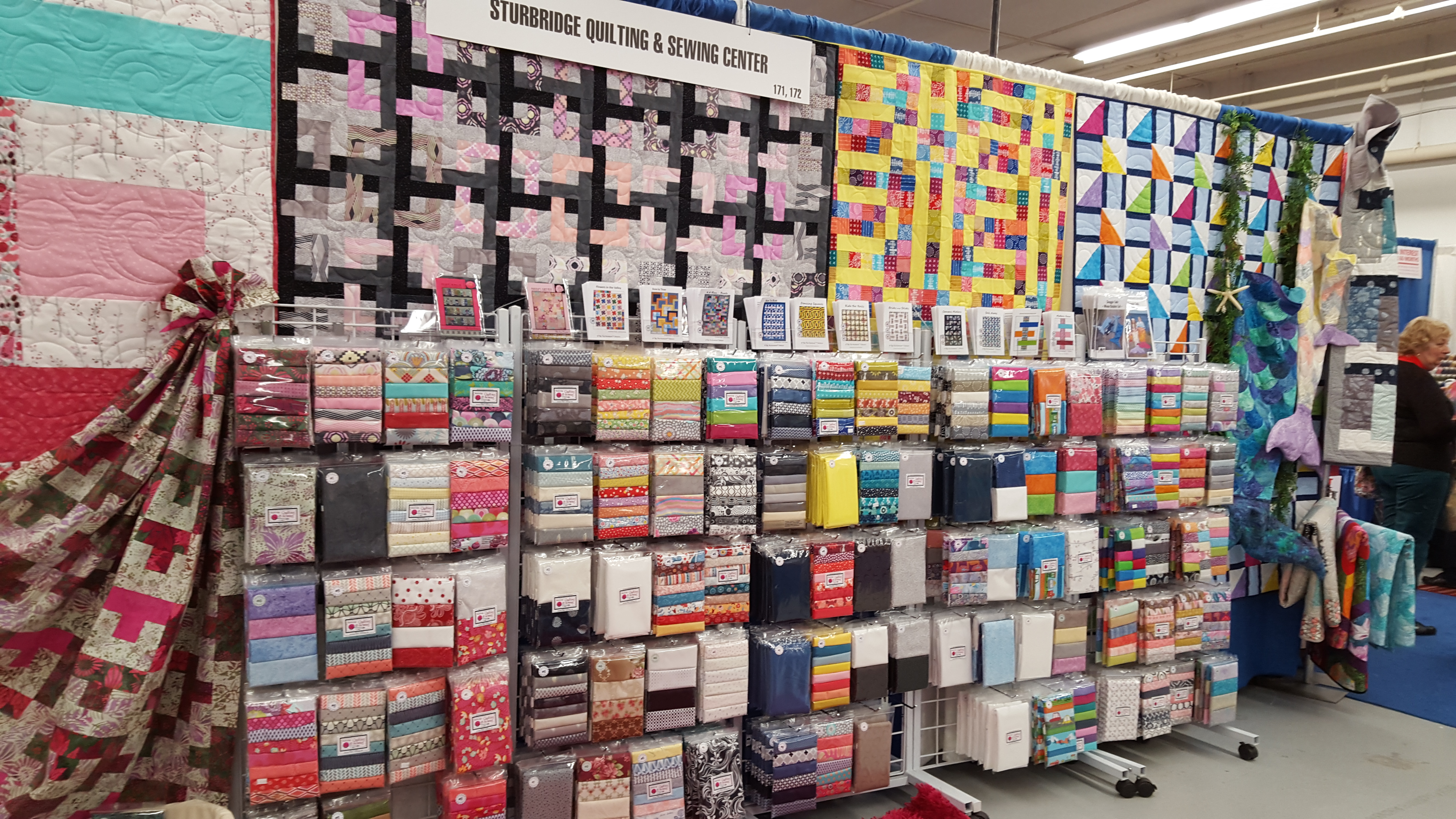 Gina at Sturbridge Quilting and Sewing had a “Debbie corner” in her booth. These are my newest patterns! Look for them on my website very soon. The Snuggle Tails ended up on Gina’s” Sail Away” quilt.