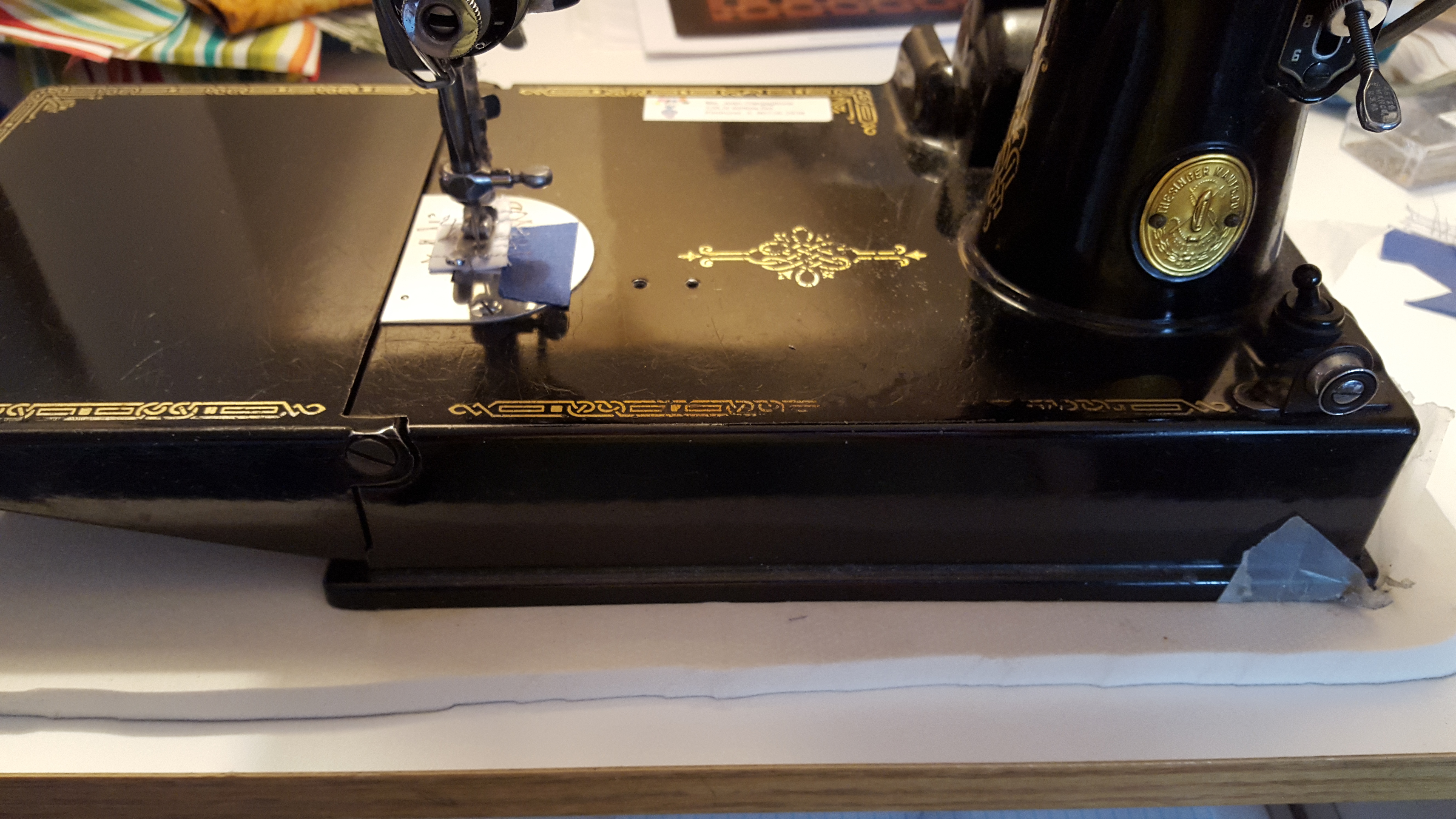 As I’ve mentioned before, I travel with my machine and piecing. When in a hotel room I am aware of the noise my machine makes. To help soften the sound I use a piece of an old floor pad. #1 – Use a floor cushion pad to muffle machine noise.