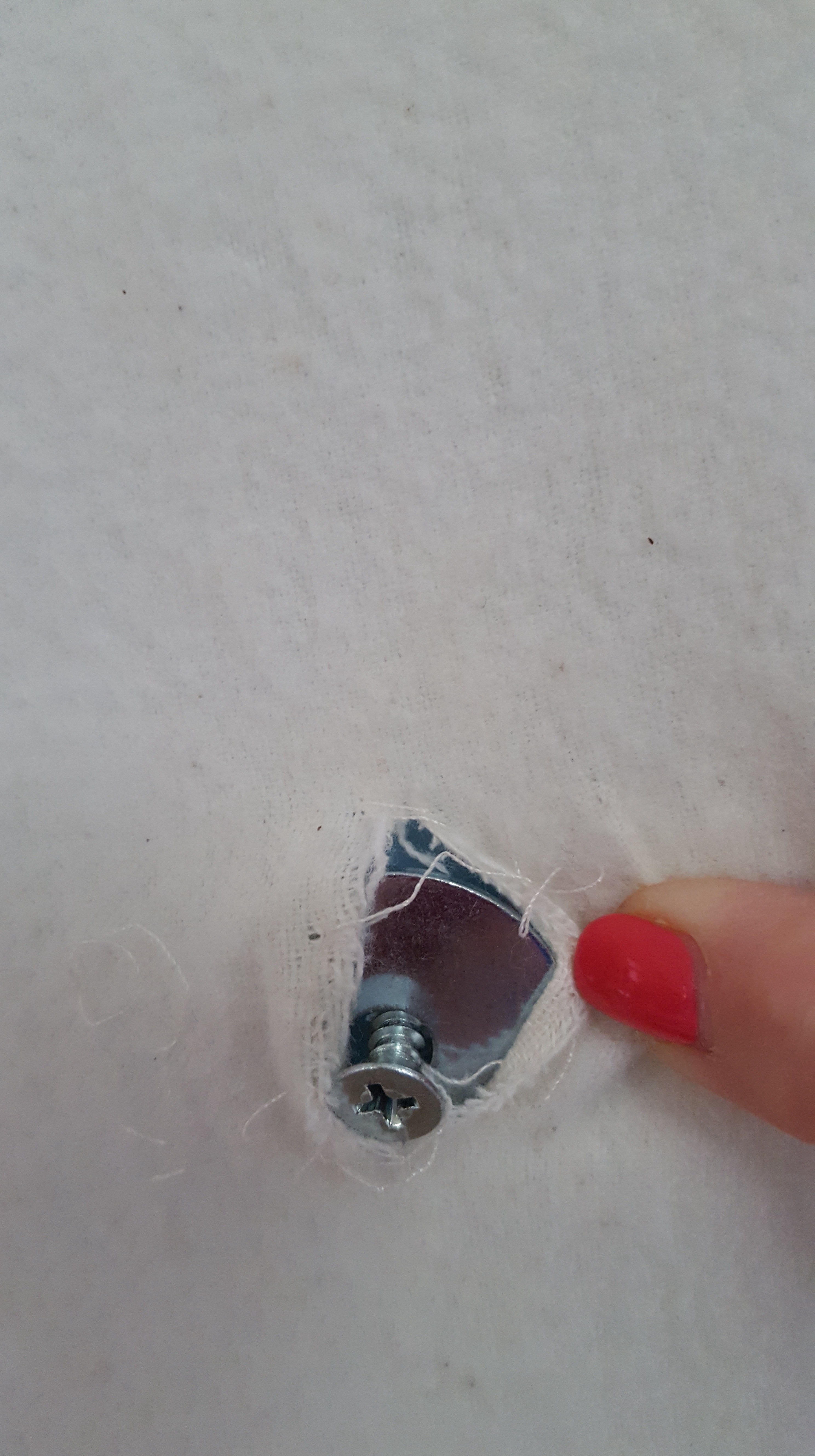 Mark the placement for hanging.  For the greatest stability, measure wall stud distances and mark accordingly.  We drilled a hole through the board, BUT made a slit in the flannel so the drill did not chew up the flannel.  (Or drill the holes first and then cut slit after board is covered.). A flat 1″ washer goes between the board and the long screw.  Make sure the screw is long enough to go through the board and into the wall/stud.  We used a 1 1/2″ flat head wood screw.