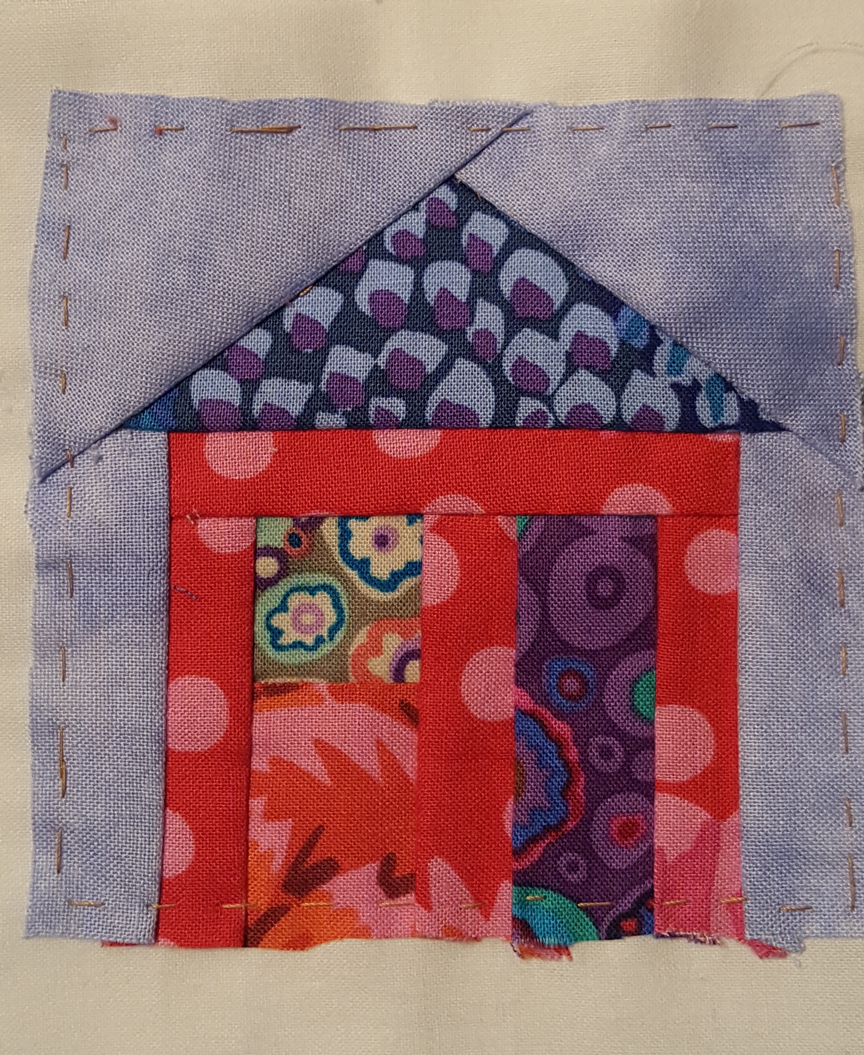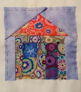 I just love a fabric that I can see many different “designs” in. I’ve been working on some Tiny houses for samples for my mini class at Pinwheels and Friends in November. I’ve been choosing brights! I love Kaffe Fassett’s colors and large prints! They provide so many options when looking for designs that can have “double meaning” ( for lack of better words). When looking at the fabric below, sure you see flowers, but what else? How about roof tiles?!?