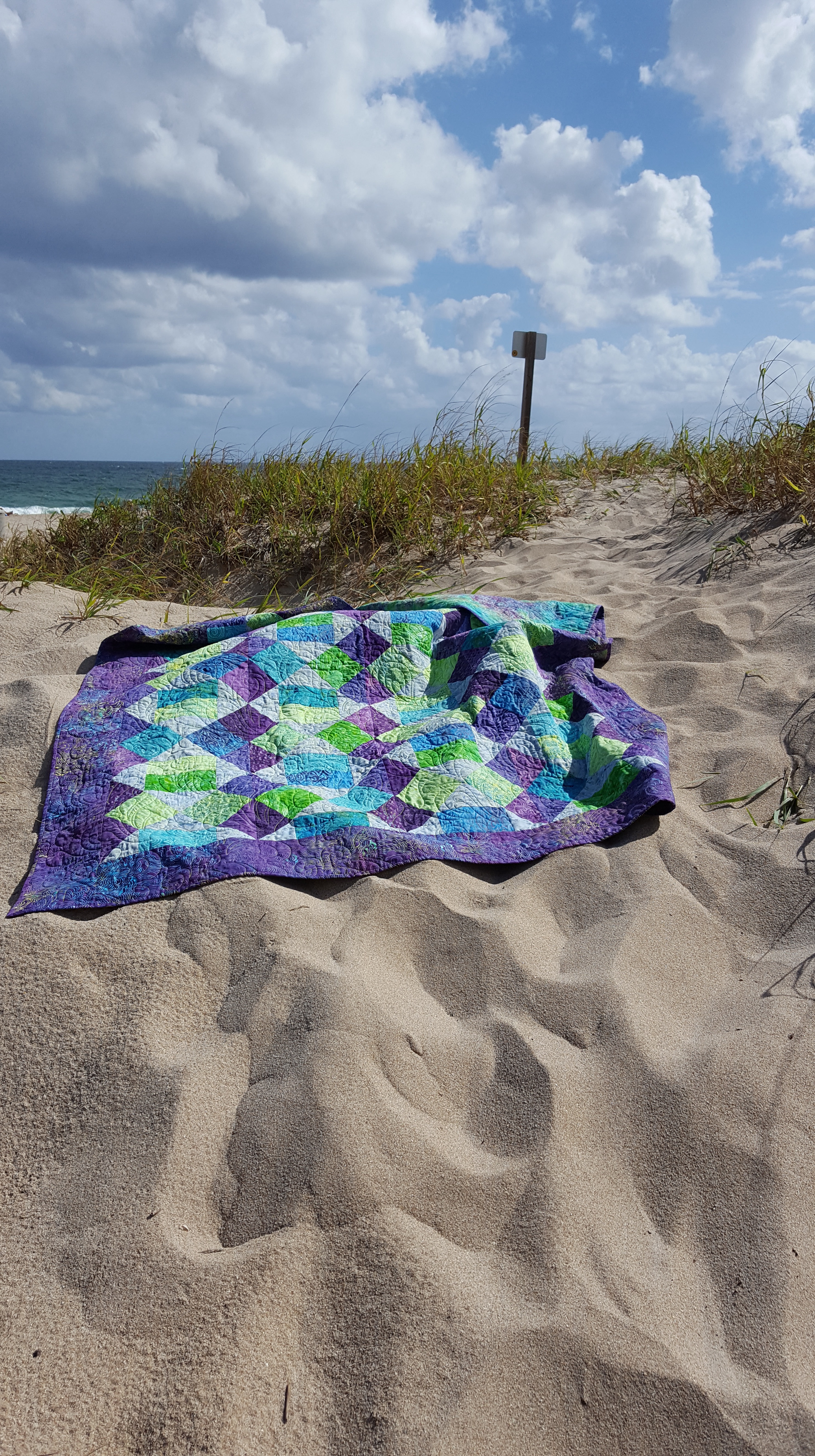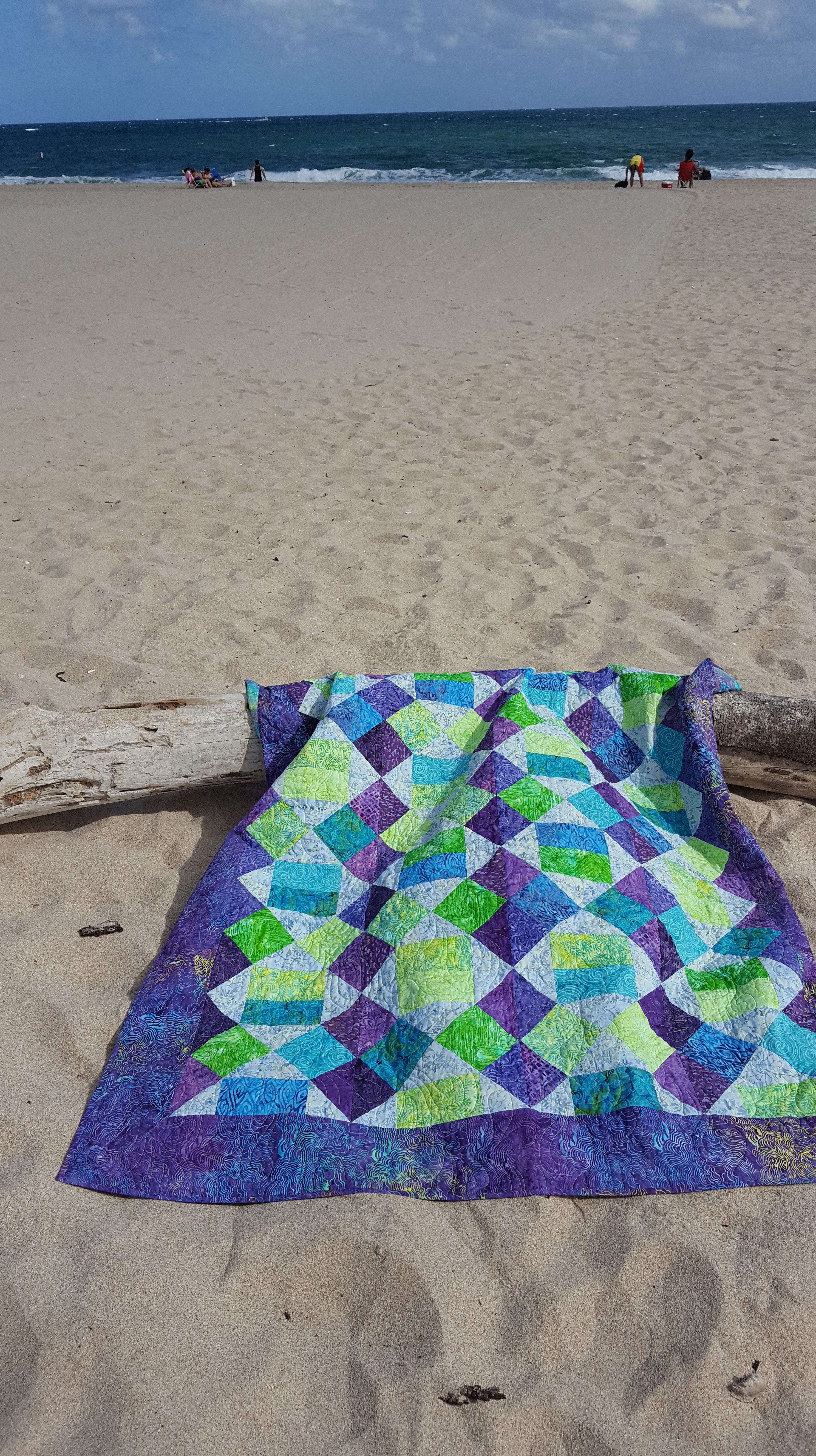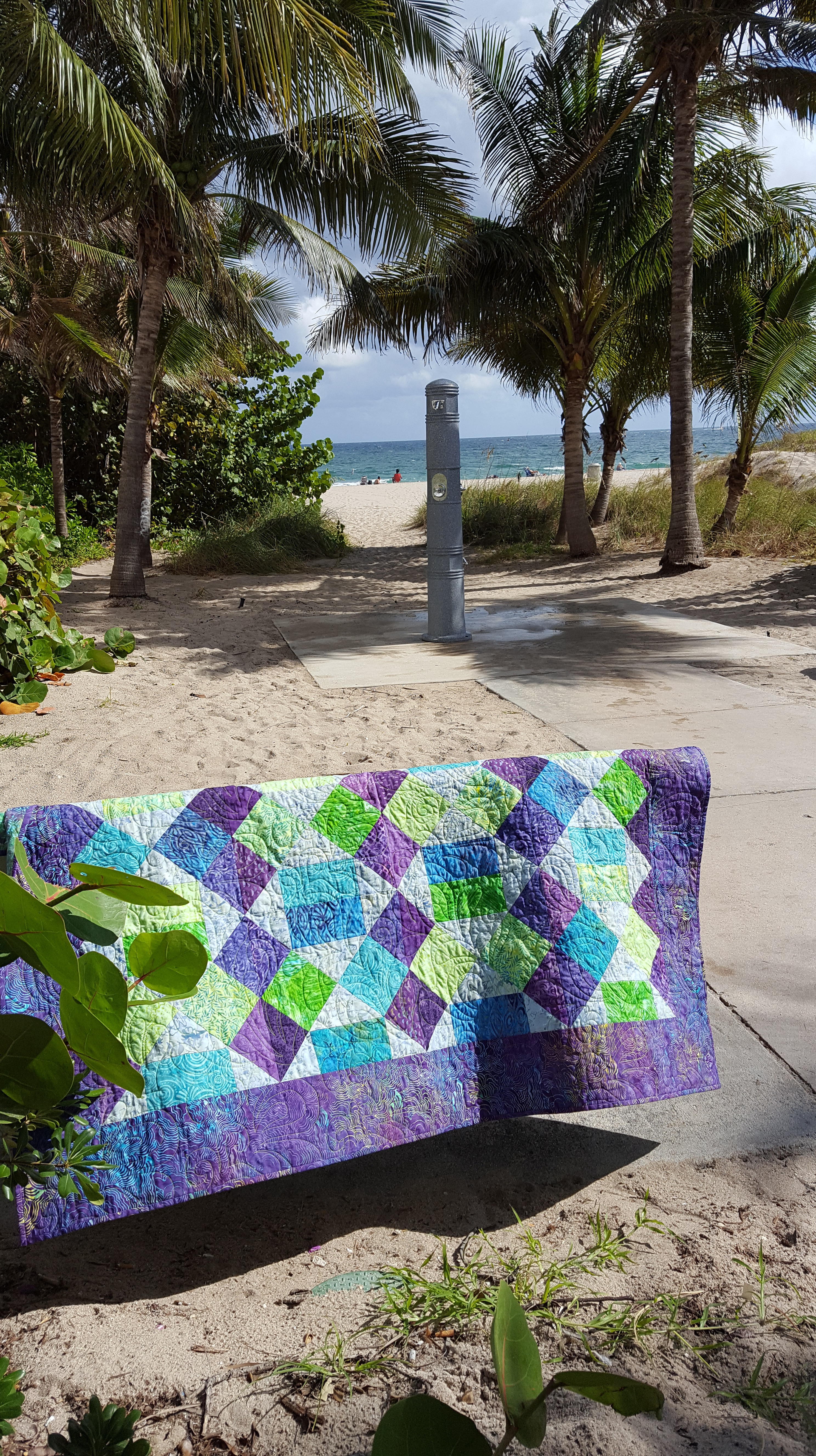After finishing the “Sea Glass” version of R-W-B Boise, I wanted some good photos of the quilt. The quilt was a present for my step daughter and it was staying in south Florida. I wanted a beach picture! So, one morning I headed to the beach. It was a very windy day and very difficult to get a photo. I did what I could to get some shots. I’ll put a few below!