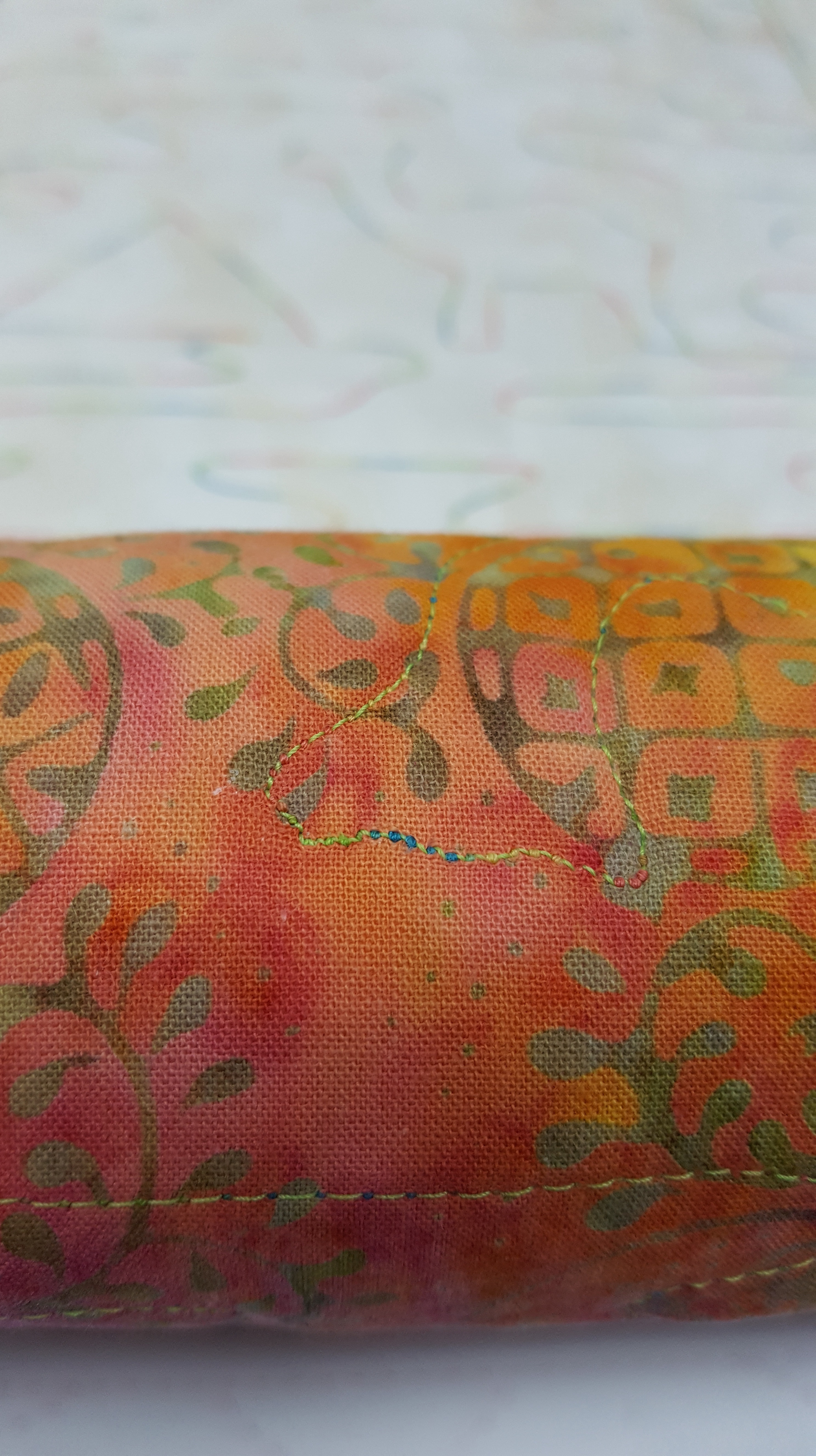 Checking tension is important when beginning with new threads. I used a variegated by Signature on top and “Sew Fine” by Superior in the bobbin.
