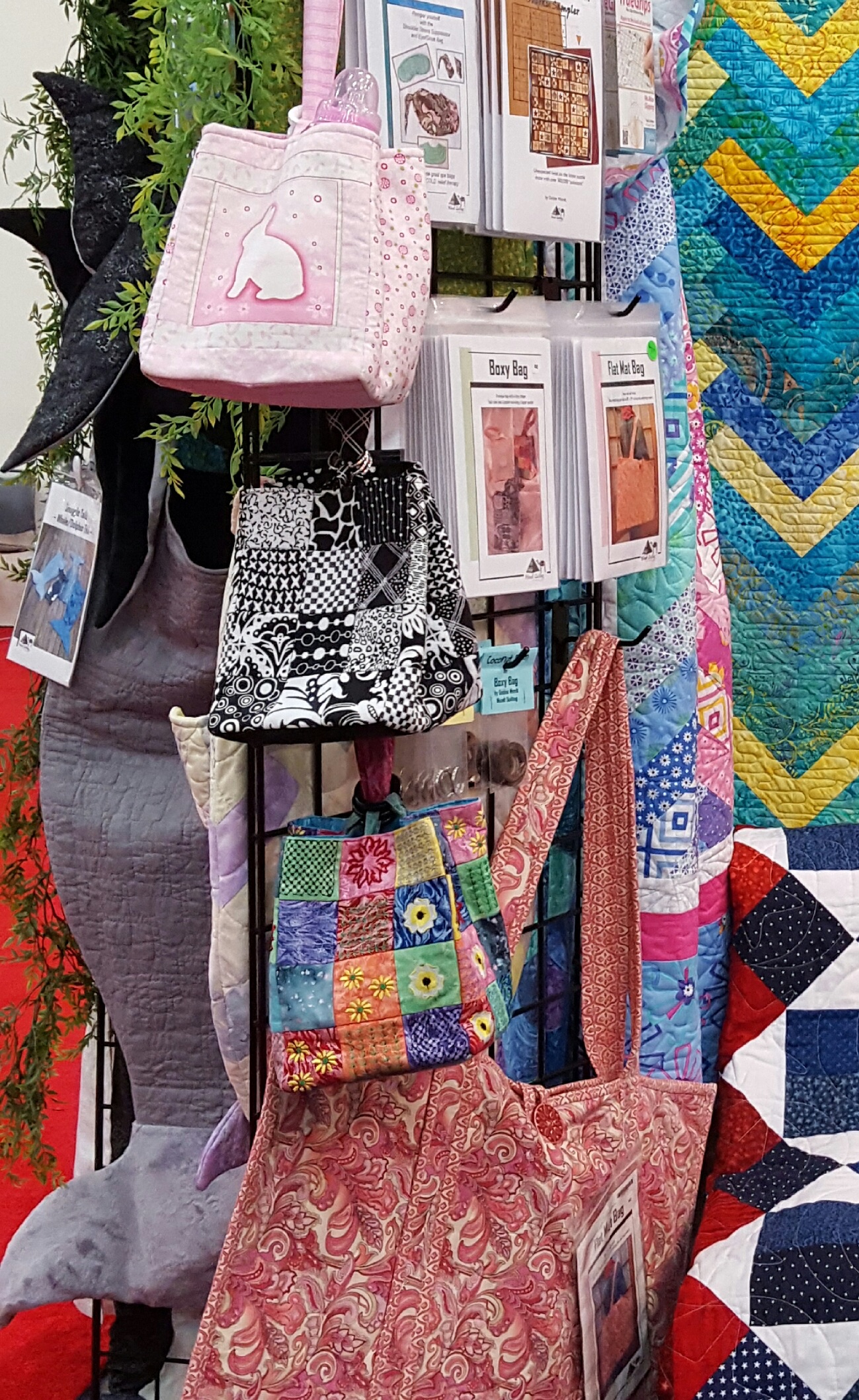 I hate to start my blog this week with a negative…but I must. One of my Boxy Bags was stolen out of my booth during the AQS show in Daytona Beach. The empty hook shown below is where one of my Boxy Bag samples had hung.