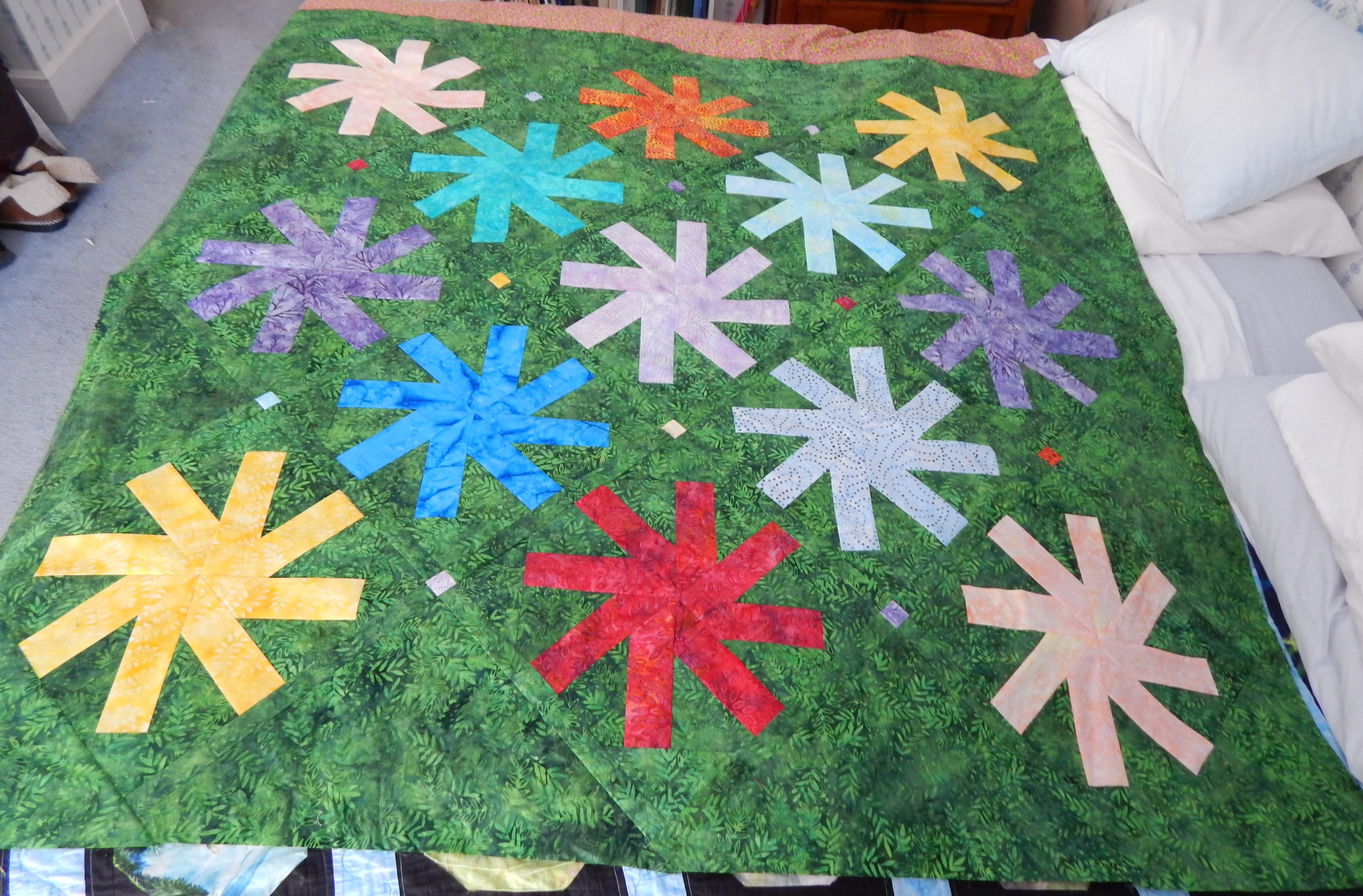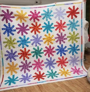I LOVE getting photos of my student’s progress and even finished quilts! Last week on Sew Central’s FaceBook page (Sew Central is in Merritt Island, FL) one of my students finished quilts from the Babes on the Beach Retreat was featured. I’m so excited about this Twirl-A-Tool quilt for several reasons. 1- it is done!, 2- it is beautiful!, 3- it is set straight! (instead of on-point like the cover quilt). Take a look at Susan’s quilt…wonderful!