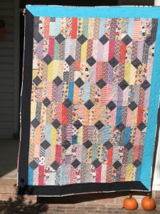 I had a nice visit today with a student from the Lewes, DE guild from a few years ago. I remember her quilt from class as I loved her fabric choices! I was shopping at the local shop the day before class and I helped her decide on her diamonds for her “Diamond Tipped Tools” quilt. She was kind to send me photos so I could share her beauty with you! Nicely done Cheryl!!