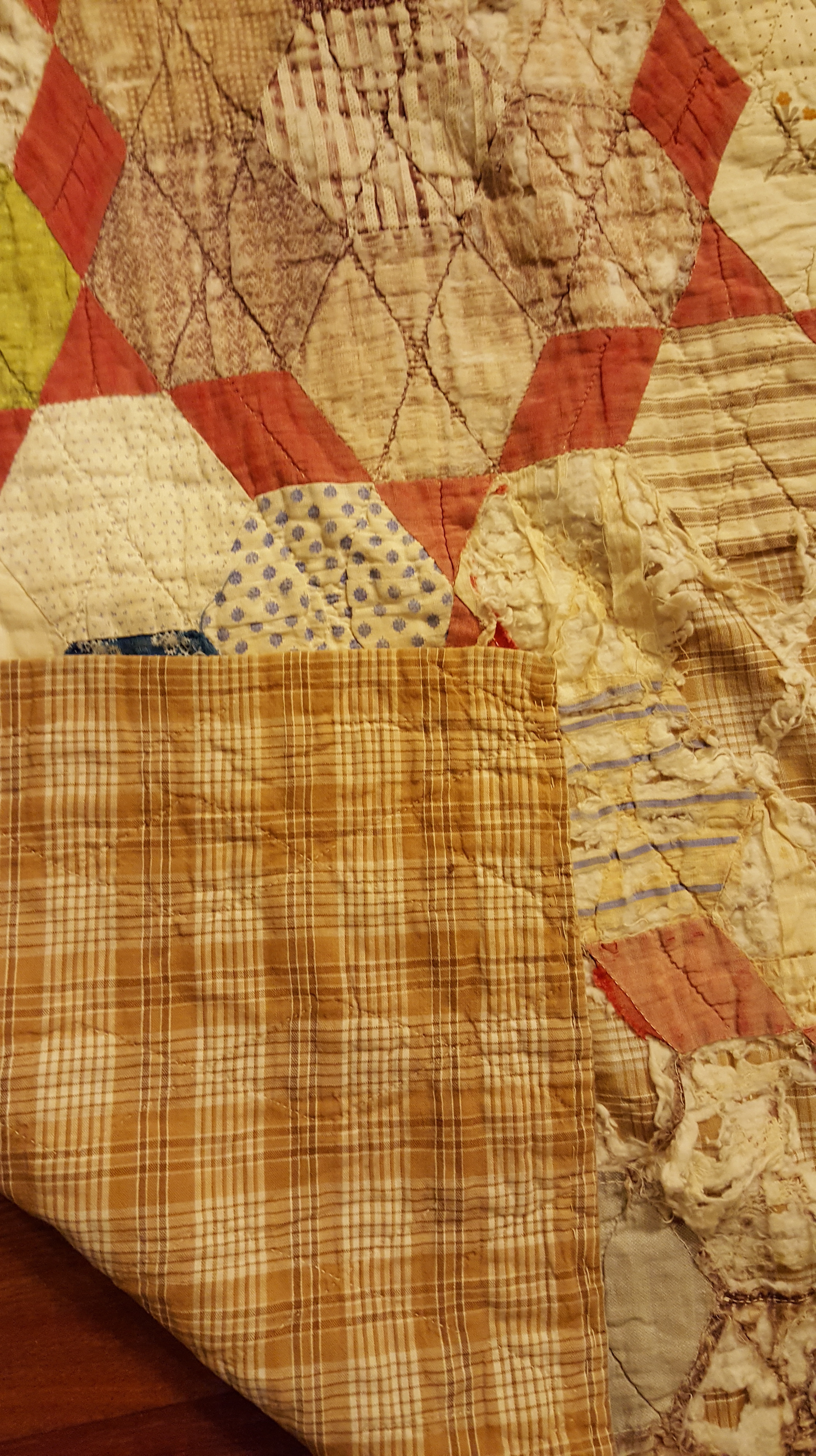Also, I got a couple pics of antique quilts. First, a lone star and I love how they changed fabrics in the same position. Still the same colors but completely different fabric. Love that kind of inspiration! The second is a Hexagon with back to front binding. Great plaid backing!