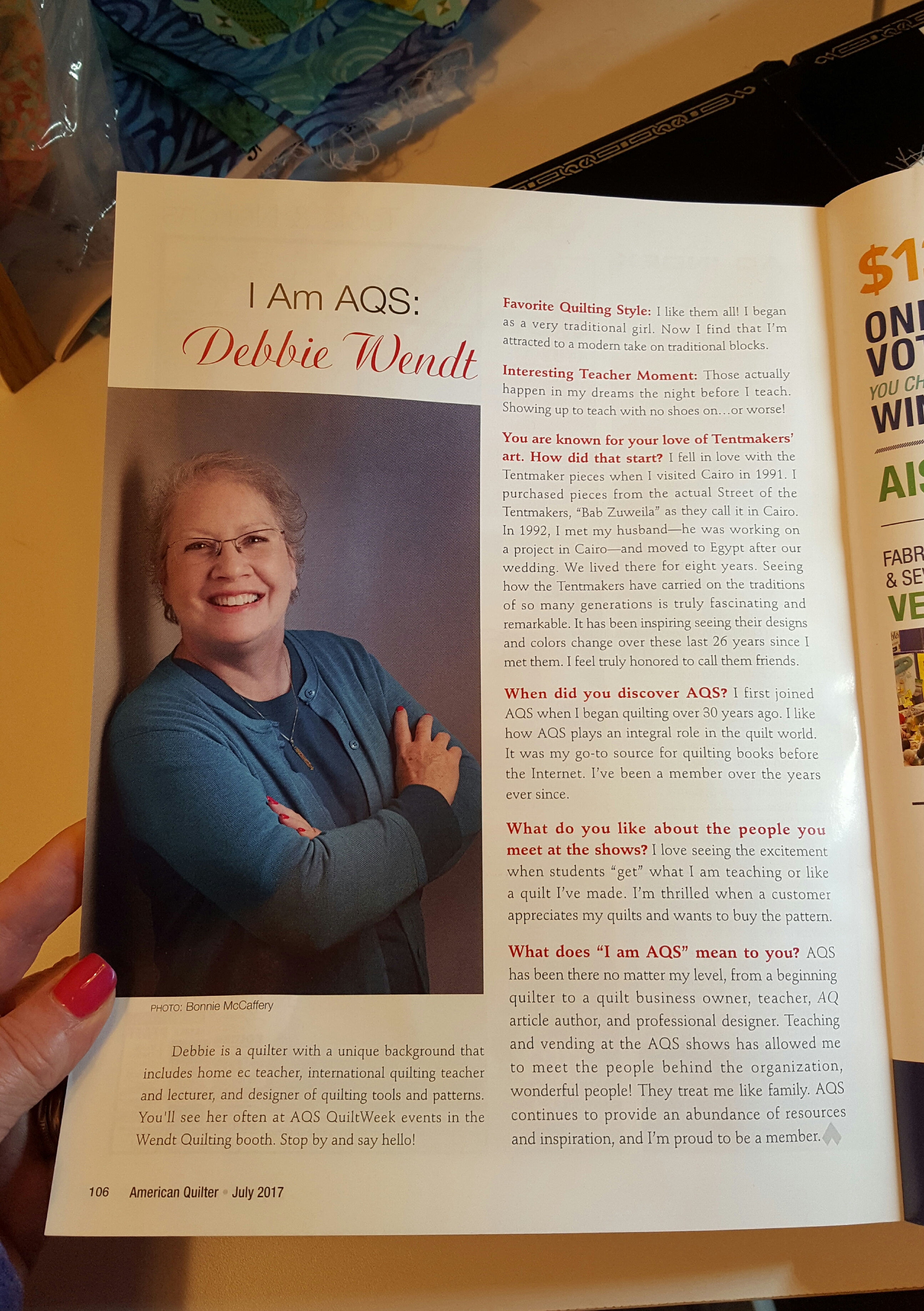 I’m so proud and excited to be chosen for the article. If you are not an AQS member and want a copy, you can find the information on their website, AmericanQuilter.com. As the article says, I’ve been a member for most of the at last 30 years. This issue has the winners from Spring Paducah Quilt Week and Lancaster. Quite a lot of eye candy!!