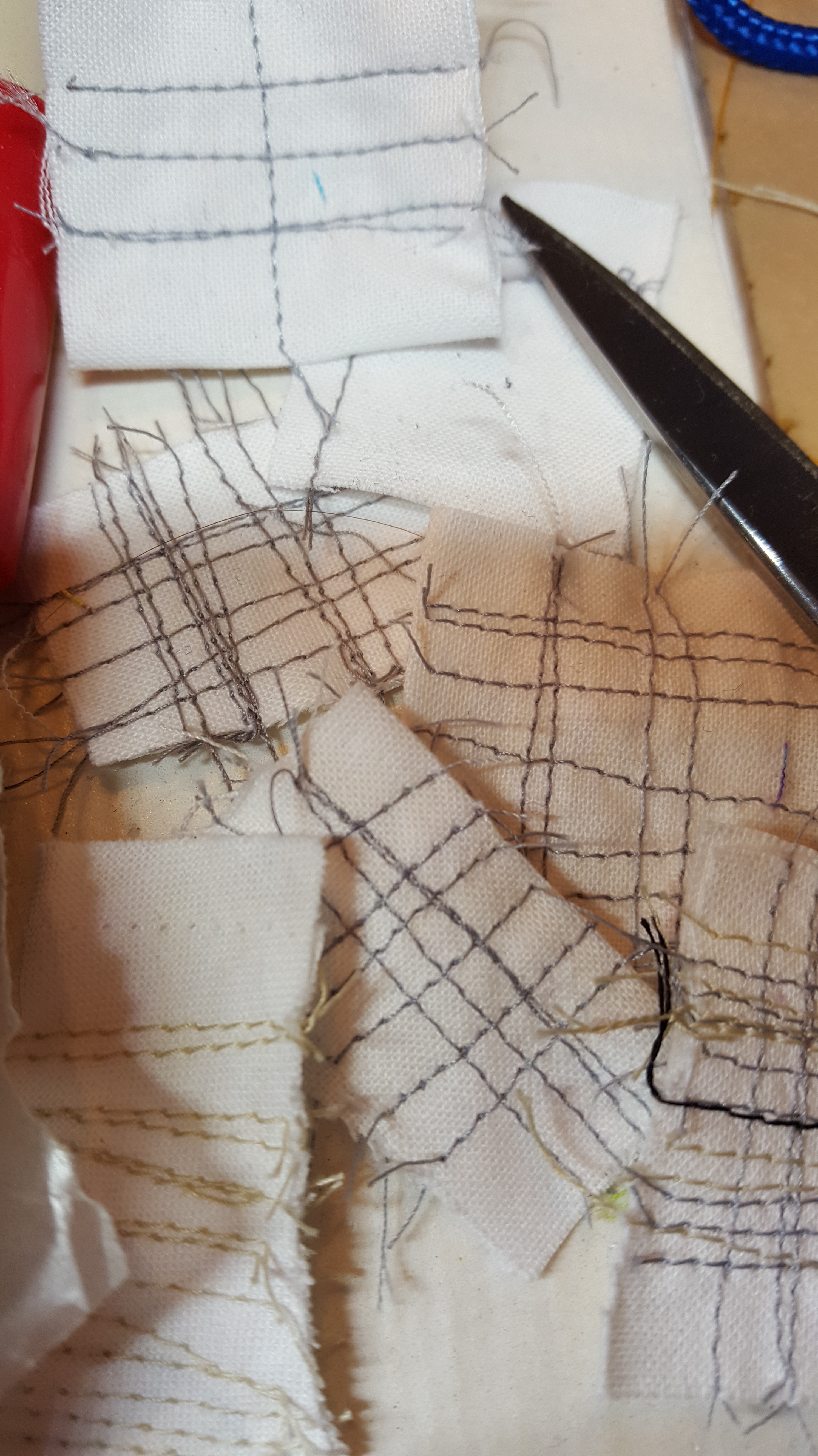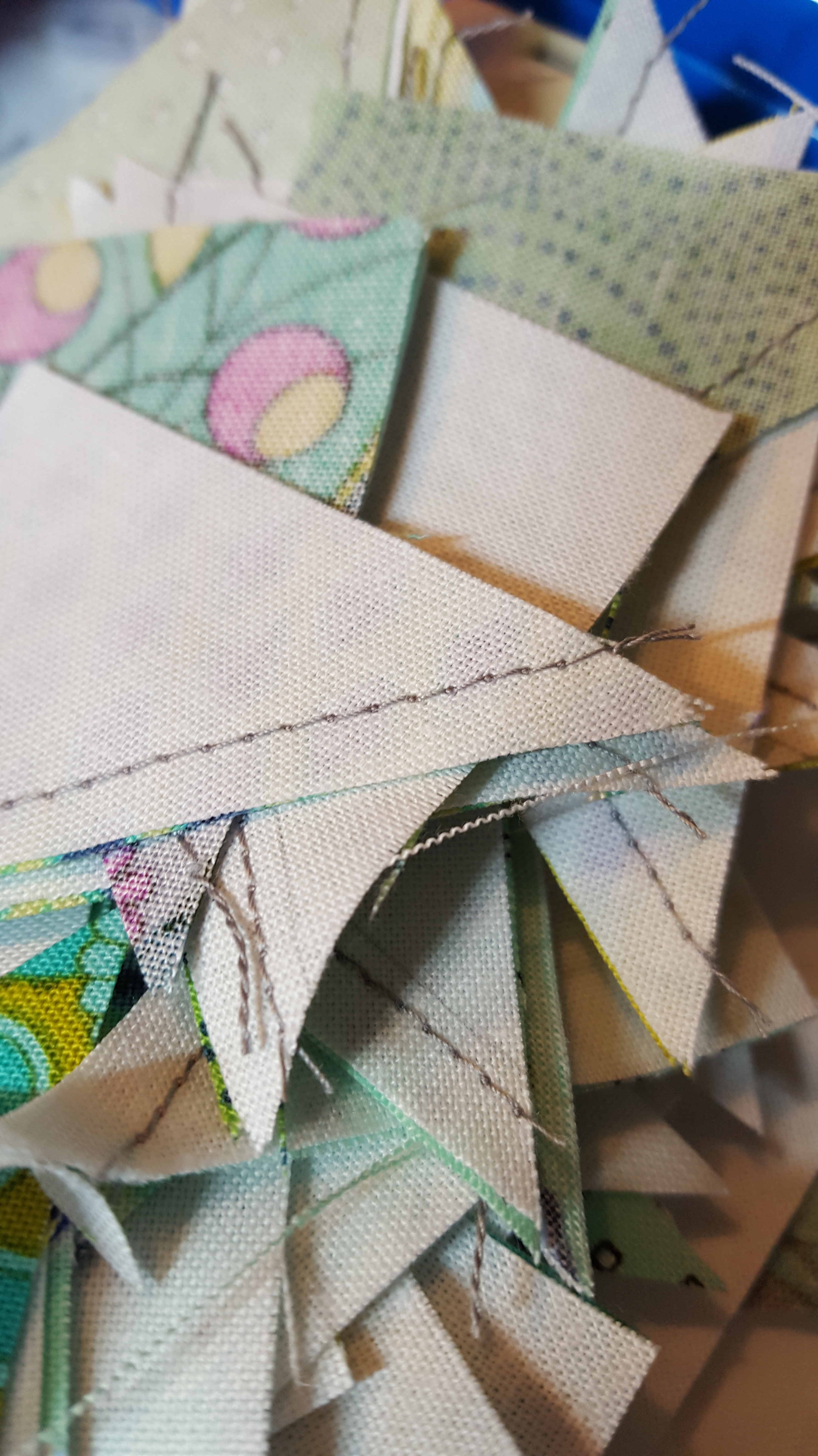 In sewing the above mentioned quilt, I had a BUNCH of cut off corners when I made the units. So, I used them as Starters and Enders! Now, I have a bunch of half squares to use in another project! Much better than having a bunch of pieces that will only be thrown away. Checkout the piles below…what usually is the starters and Enders vs. sewn half squares ready to press, trim and use!