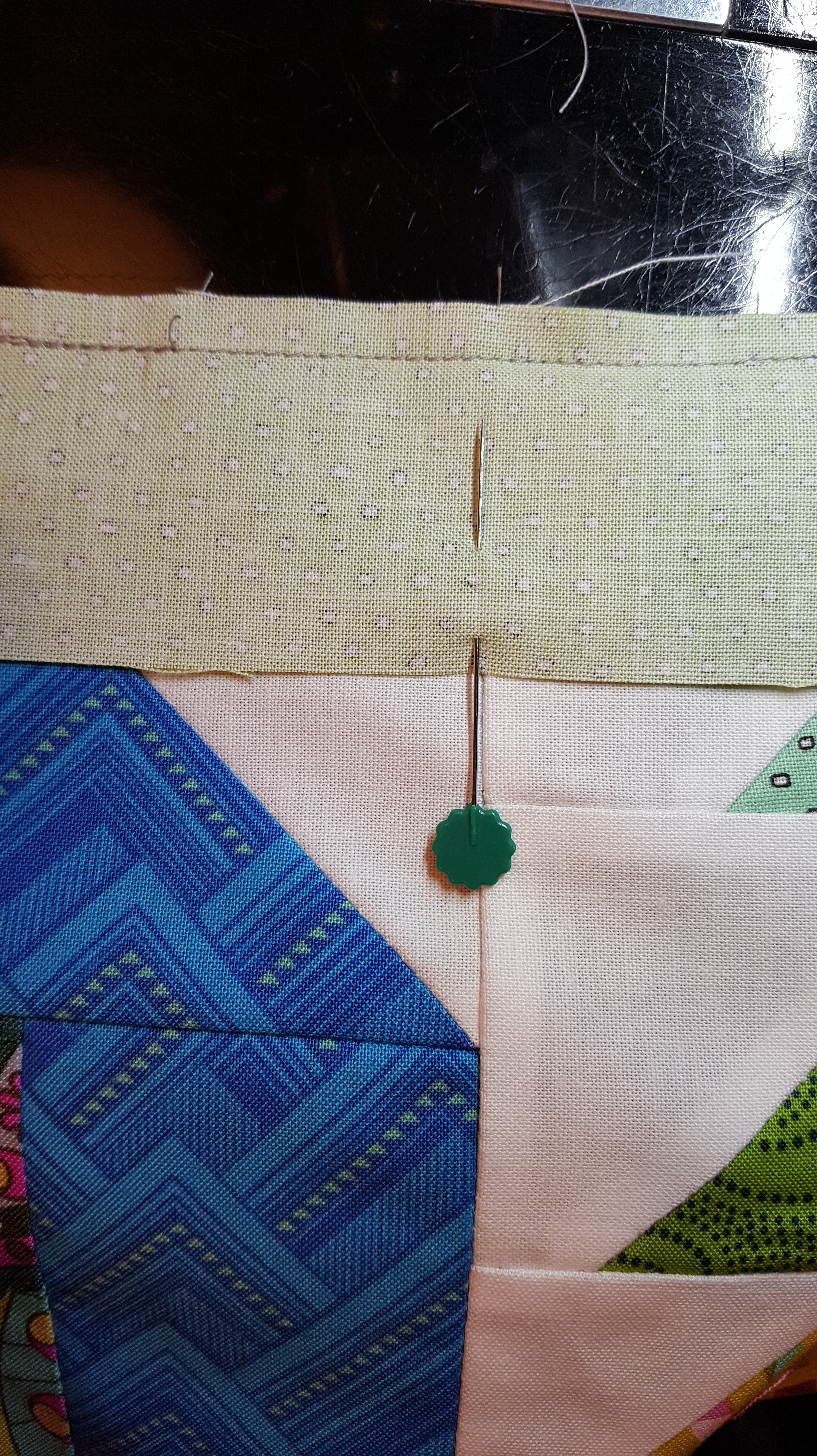 There is a sashing (grass) between the houses rows. To make sure the blocks line up vertically in the quilt, I am careful to align the seams. I place a pin at all the block seams before I add the next row of houses. Then, you can easily see where to line up the row! Photo is of pin on seam. The next row is added above the sashing in this photo.