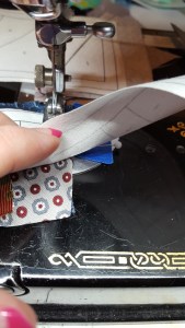 I put the next piece in place and again, used pins. This time I put the pins on the unstitched side so it would be easier to removed as I sewed the seam. The pin is hiding up by the blue tape.