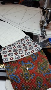Remember that box of ties? I’m playing with some of them today. Working on a block for a new class I’m developing for the Blackstone Valley Heritage Quilters Guild. I’m using a muslin foundation because most of the ties are silk and I’m going to leave the foundation in after the block is made. This will help stabilize the silk!