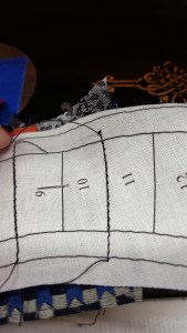 Silk is slick! After I sewed a piece to the muslin foundation, I used a pin to keep the fabric in place. (I did not want to use glue with the silk.)