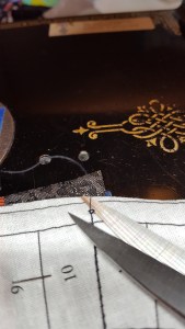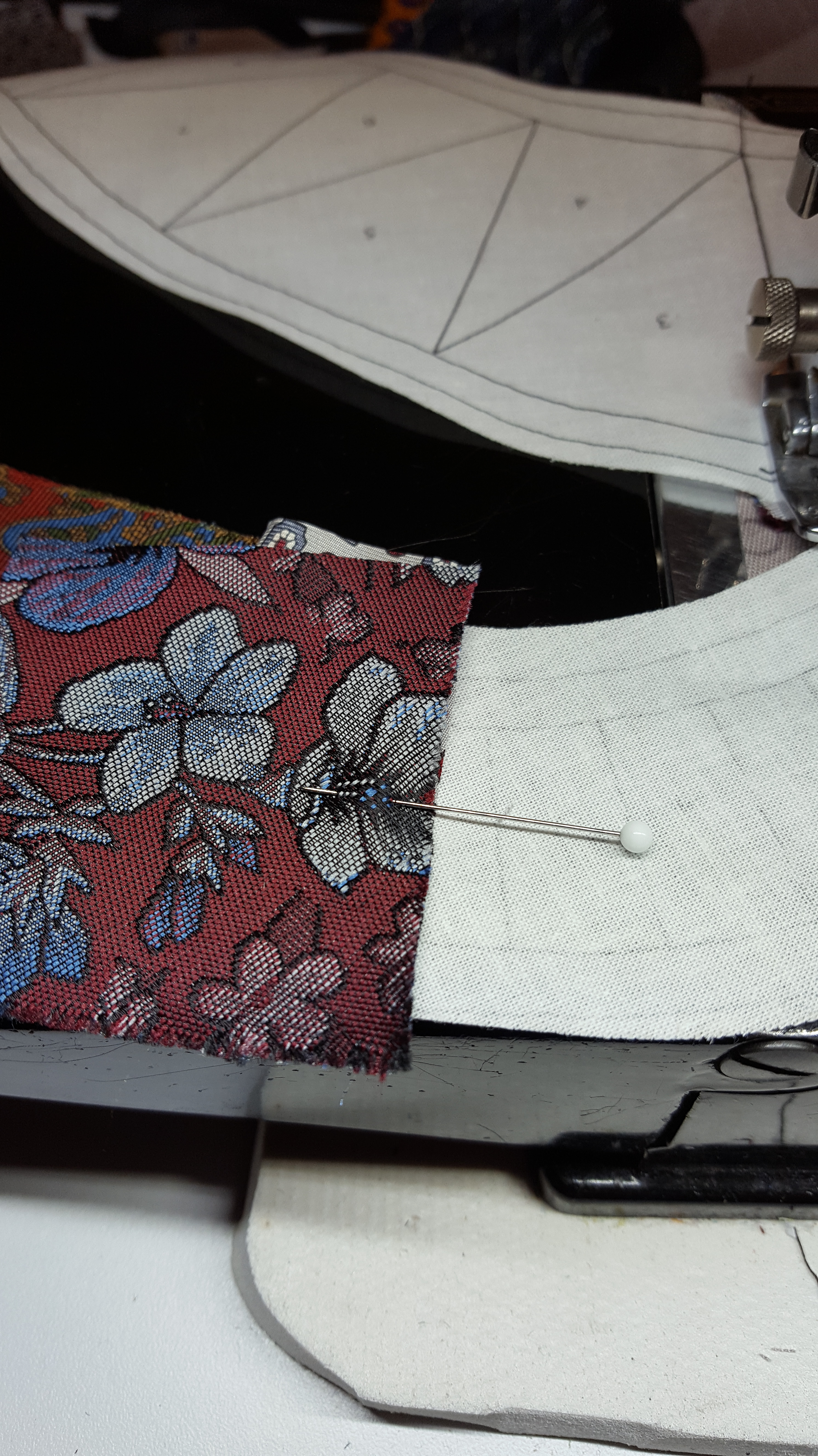 Silk is slick! After I sewed a piece to the muslin foundation, I used a pin to keep the fabric in place. (I did not want to use glue with the silk.)