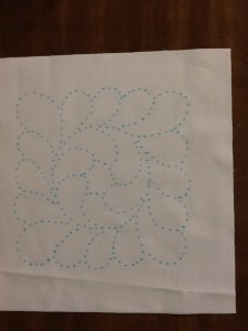 I used DBK template plastic to make the design easier to trace on my quilts and for use in my classes. (YES, I have permission!!). The plastic has nice flexibility and works well. I used a tiny punch (used to punch holes in leather) to make the design. This is a great way to use work with the design. I have also used iron out chalk in a pounce pad when marking on darker fabrics. The class sample is white so the blue pen was the choice this time.