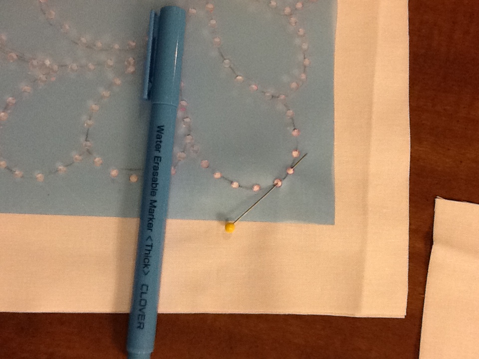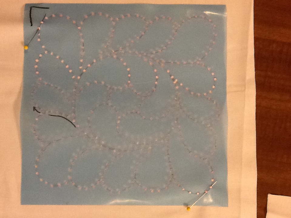 I used DBK template plastic to make the design easier to trace on my quilts and for use in my classes. (YES, I have permission!!). The plastic has nice flexibility and works well. I used a tiny punch (used to punch holes in leather) to make the design. This is a great way to use work with the design. I have also used iron out chalk in a pounce pad when marking on darker fabrics. The class sample is white so the blue pen was the choice this time.