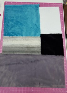 Fall Quilt Market is fast approaching. That means sewing, sewing, sewing! I’m working on a “Cuddle” quilt and had some leftovers. So, I decided to add a pillow as a bonus to the pattern. In working with plush fabric there are some tricks to make things easier. One, don’t rush! Soft, plush fabric has a nap. And it is best to take it slow when sewing. Also, a wider seam helps. The pillow below is from the leftovers I mentioned. Love the teal/gray combination! Pieces are sewn and ready for trimming.