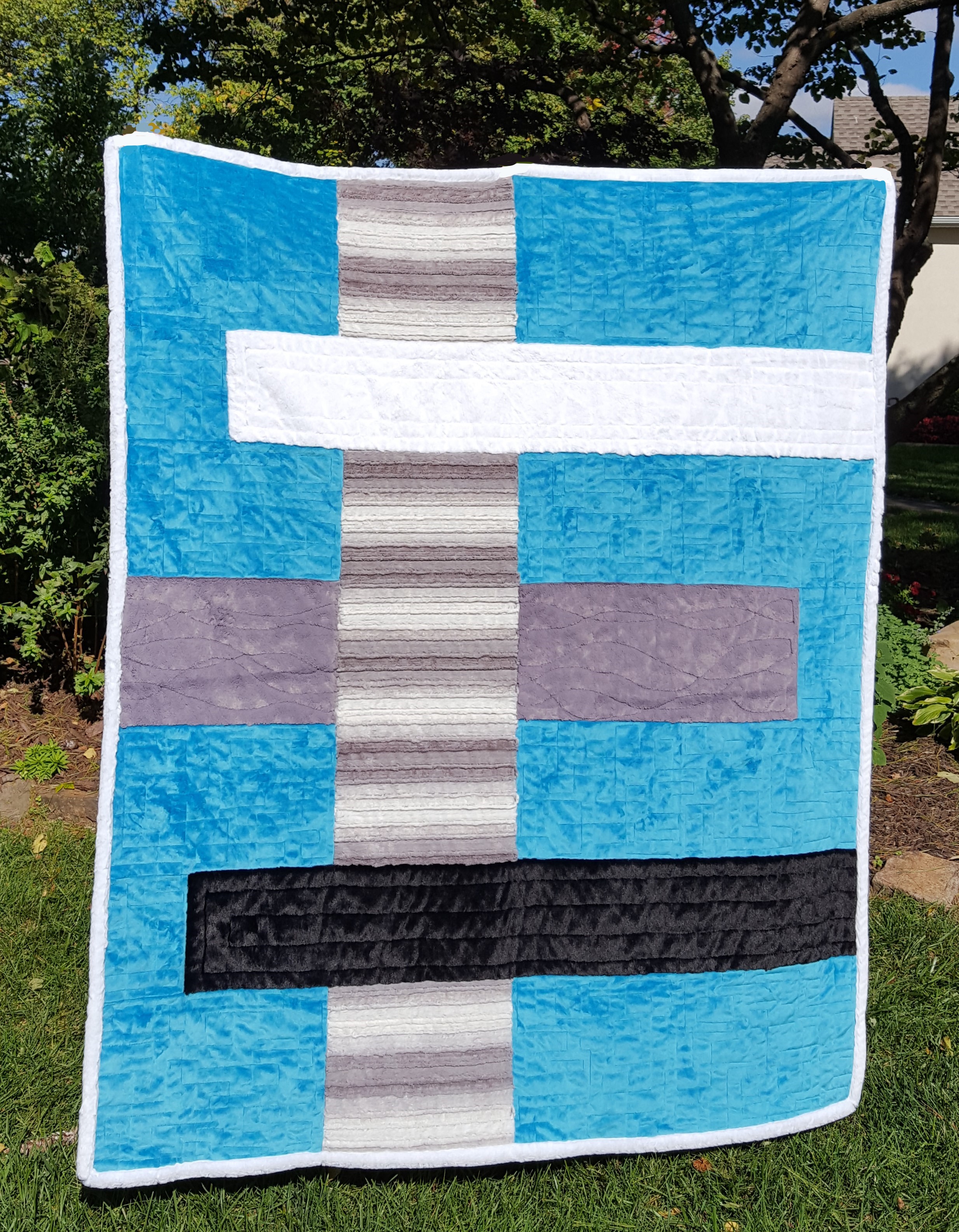 I’m thrilled with how it turned out! It is a variation of Gina Zeleznok’s Modern Focus pattern. YES, I have permission! It will add to the BTN fabric system with using extra wide Cuddle fabric. Cuddle is 58/60″ wide. It makes a large quilt quick and easy.
