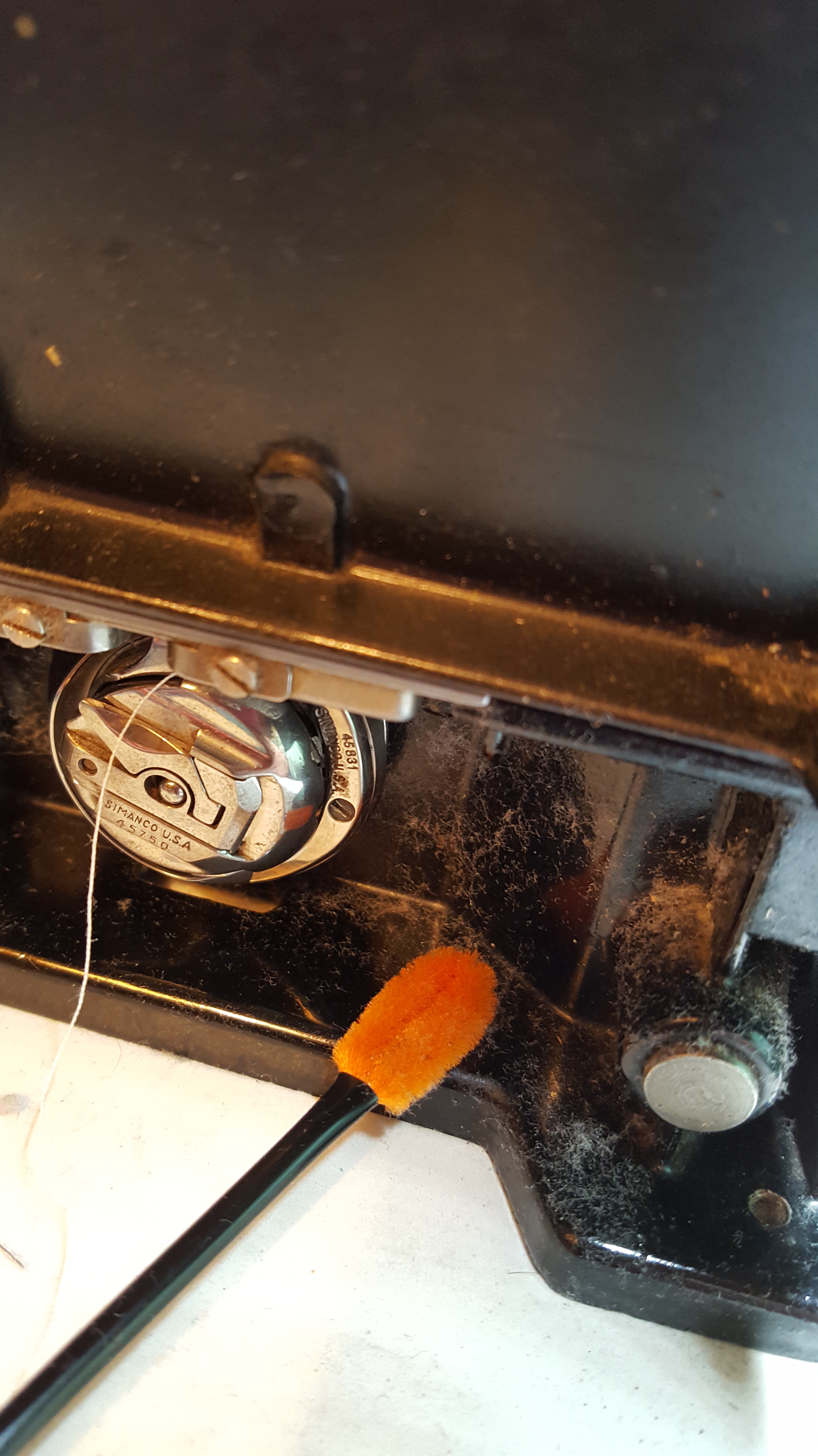 #1- Clean your machine! A homemade tool of a coffee stir-er/pipe cleaner works well to clean the lint from the bobbin area!
