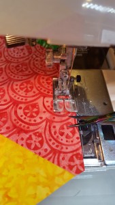 I cut between my stitching line, from the left (beginning) one section at a time and sew the next section in the line to the previous. Again, leaving the pin in the farthest left piece. Repeat until the entire row is sewn.