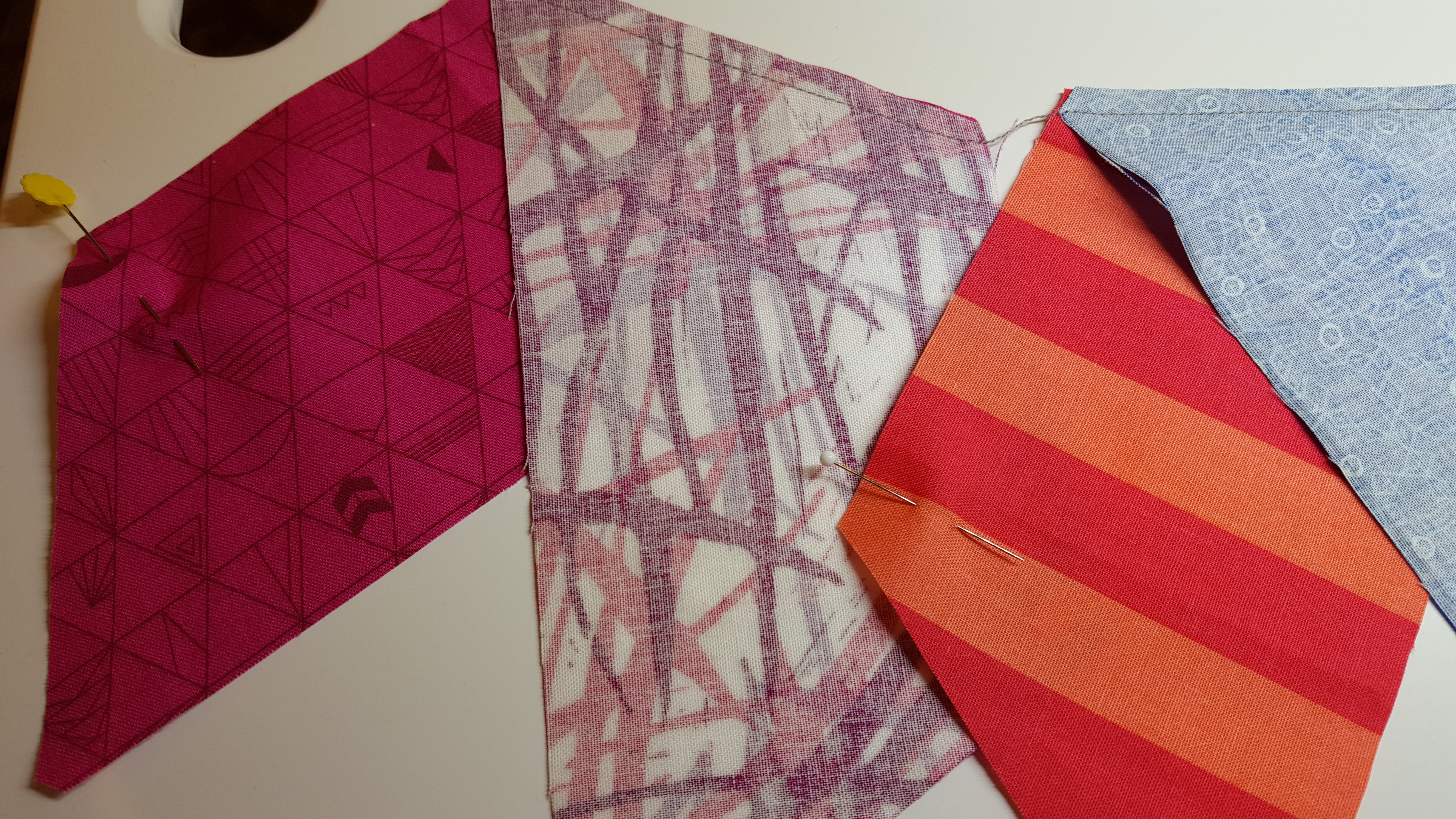 #1 – Leave “leader” in stitched row to help remember the order. And place pin in the top left piece.