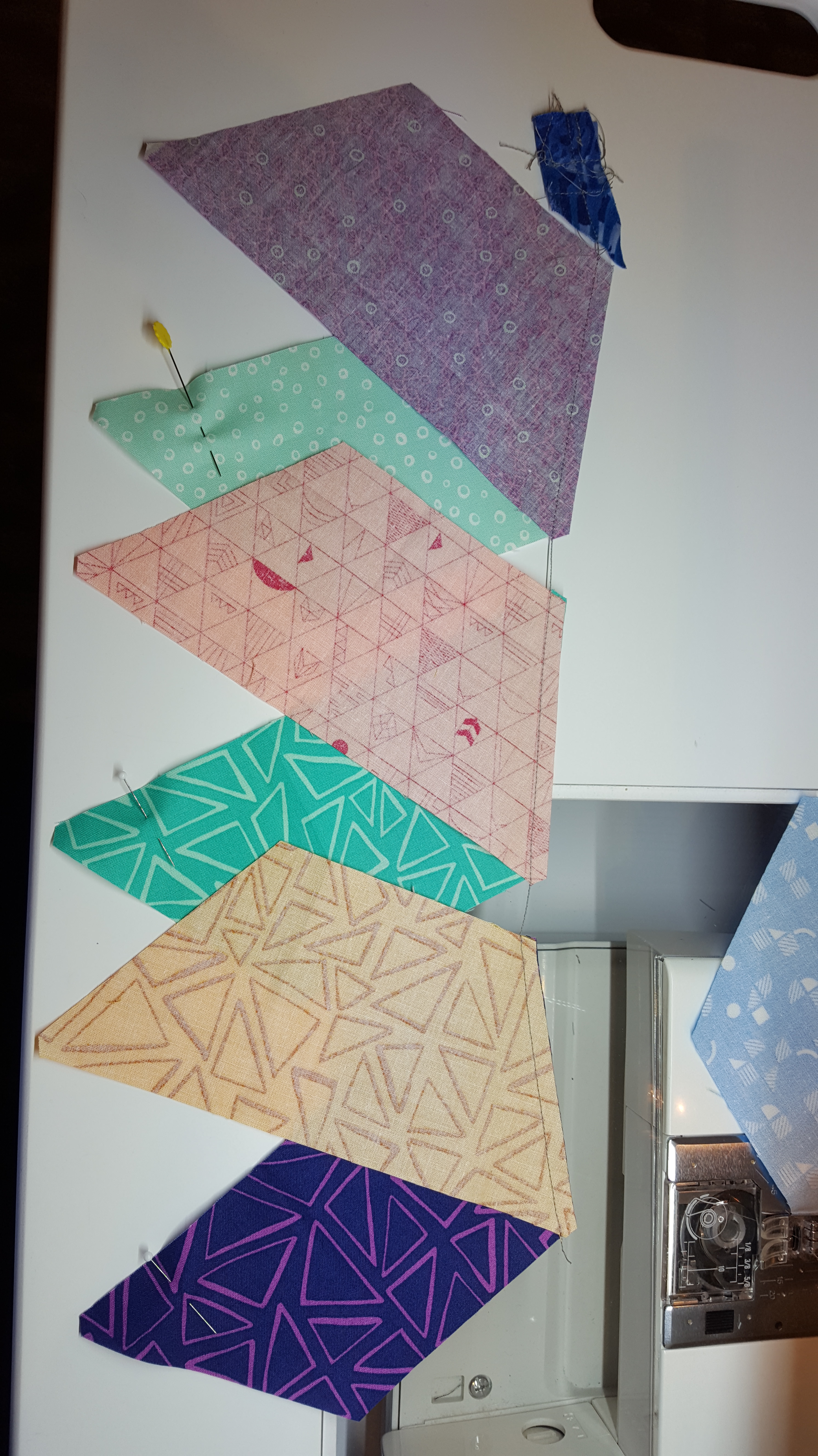 In piecing these two quilts, the half hexies are sewn in rows across the quilt. To speed up the process, I pick up one row at a time. In order to keep the pieces IN ORDER, I pick up the top piece and put a pin in the top left corner. Stitch 1/4″ seam. Then the next two, continuing to put a pin in the top left corner. Once the row is stitched, I take the row out of the machine and lay it out. It is in the order sewn with my “leader” (starter fabric) at the beginning of the line of stitched pieces.