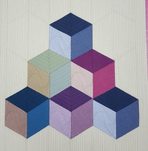 And with the Baby Blocks (or Tumbling Blocks) I took a straight approach, literally. The front of the block is a “Zentangle” inspired design called “paradox”.