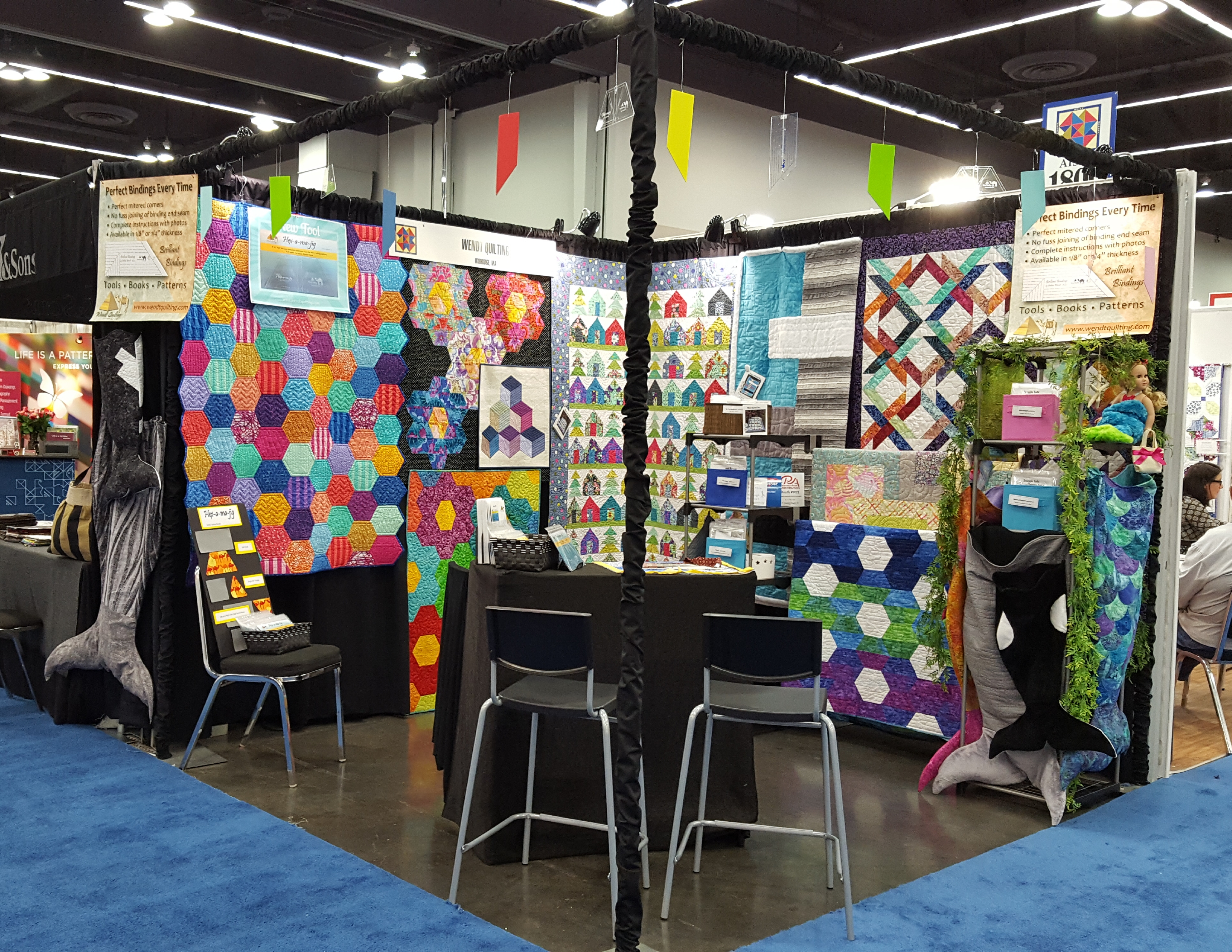 I’m back after the brief vacation. I was an exhibitor at Quilt Market, took a mini vacation, then another 2 trips for family happenings and went to a quilting professional retreat. Now, here we are! I’m back on track for Two Tips and to continue sharing my quilting journey. With all the changes to facebook and compliance with opt in notifications, I have noticed “things” don’t always happen as in the past. My posts here are not always showing up on my FB page. ;( I’m working on correcting that. I loved meeting everyone at Market! My focus was on the new Hex-a-ma-jig template and all the quilts included in the booklet included with the tool. Fun to share!