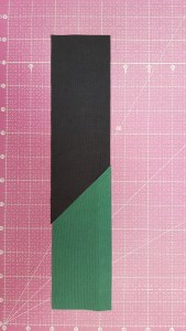 You will need to shift the pieces along the 45 cut edge to get an exact 1/4″ seam.  See the lines on the cutting mat as a reference.  This is also a short cut, instead of drawing the sewing line.  Use the mat for placement then take it to the machine and sew.