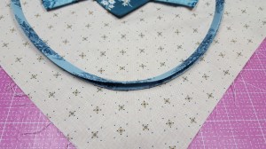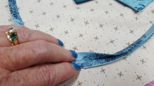 When adding the applique piece of this biased handle, I’ll show what NOT to do and then what TO do! First, do NOT applique the outside of the handle first. Look how the fullness bunches up and is not smooth.