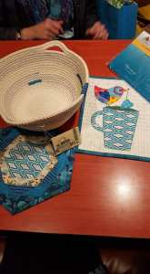 The Teal Mini Swap is underway and about done for another year. Great turnout of 650 raising $6500 for ovarian caner research. A great project put together by Beth Helfter. This is my third year to participate. I was a lucky girl as I was paired with someone I knew! Kathleen Lamansky was my swap partner. She made me a great mug rug and an awesome rope bowl. I love them both!