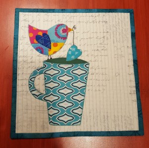 I kept the quilting on the mug rug I made simple. Background straight lines are a great way to add texture and is so easy using your walking foot. I did outline the bird, cup, hearts and I followed some of the lines of the fabric on the cup.