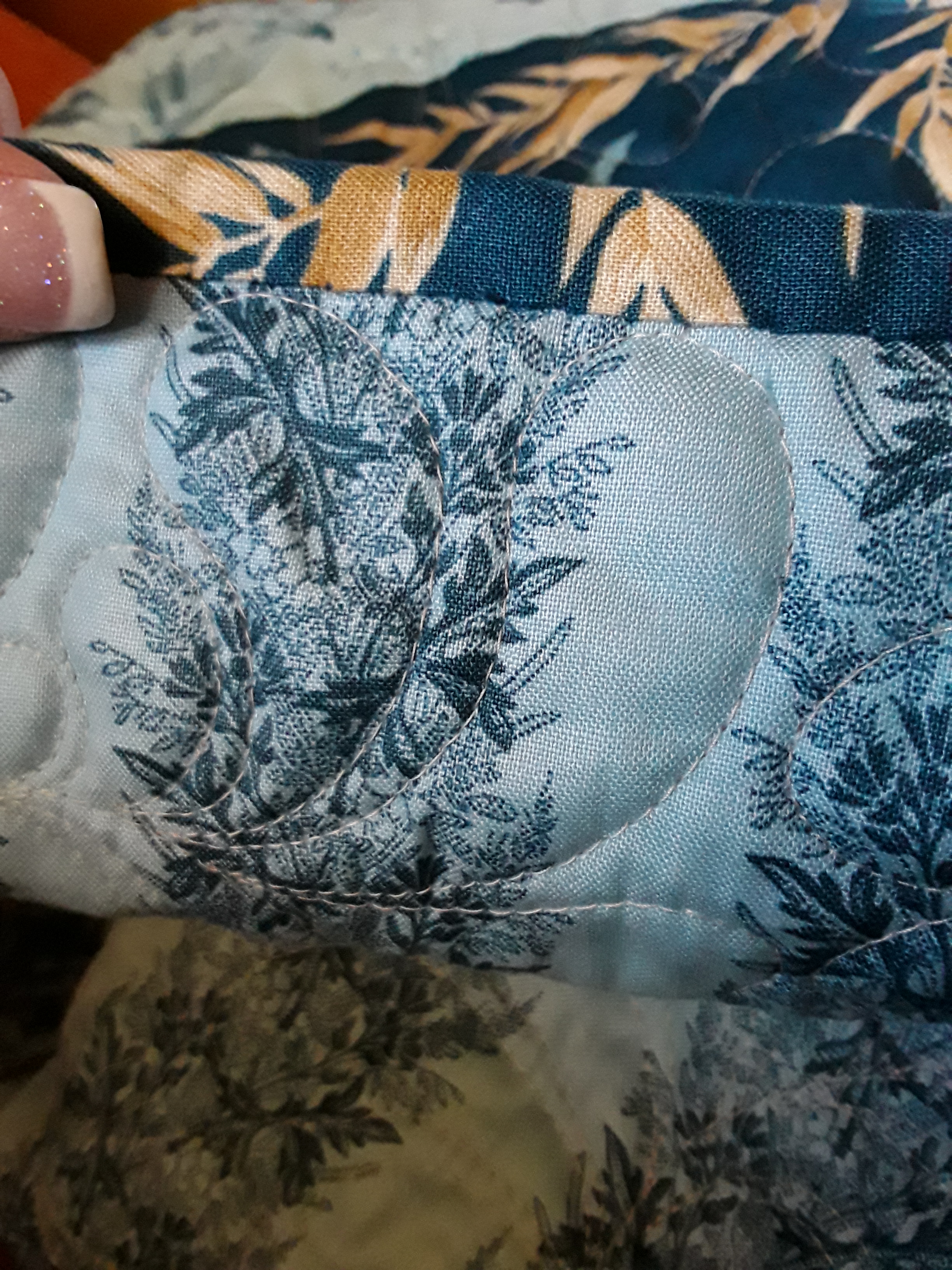 Still staying with the binding edge, I’ll share another edge tip. If possible, keep your quilting inside the edge of the quilt and not under the binding. Especially if it is a feather! It looks so much better not cutting off those beautiful feather under the binding edge! Now, I don’t worry about quilting off the edge if it is an allover pattern, just on designs that should looked finished and not cut off.
