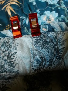 I was in the middle of sewing on the binding when I had to pack it up and bring it to Florida with me (Hand sewing looking at a beach, YES! Please and Thank you!) So as to not loose my needle, I used “Wonder Clips” to mark my place and keep the needle from getting lost in the shuffle.
