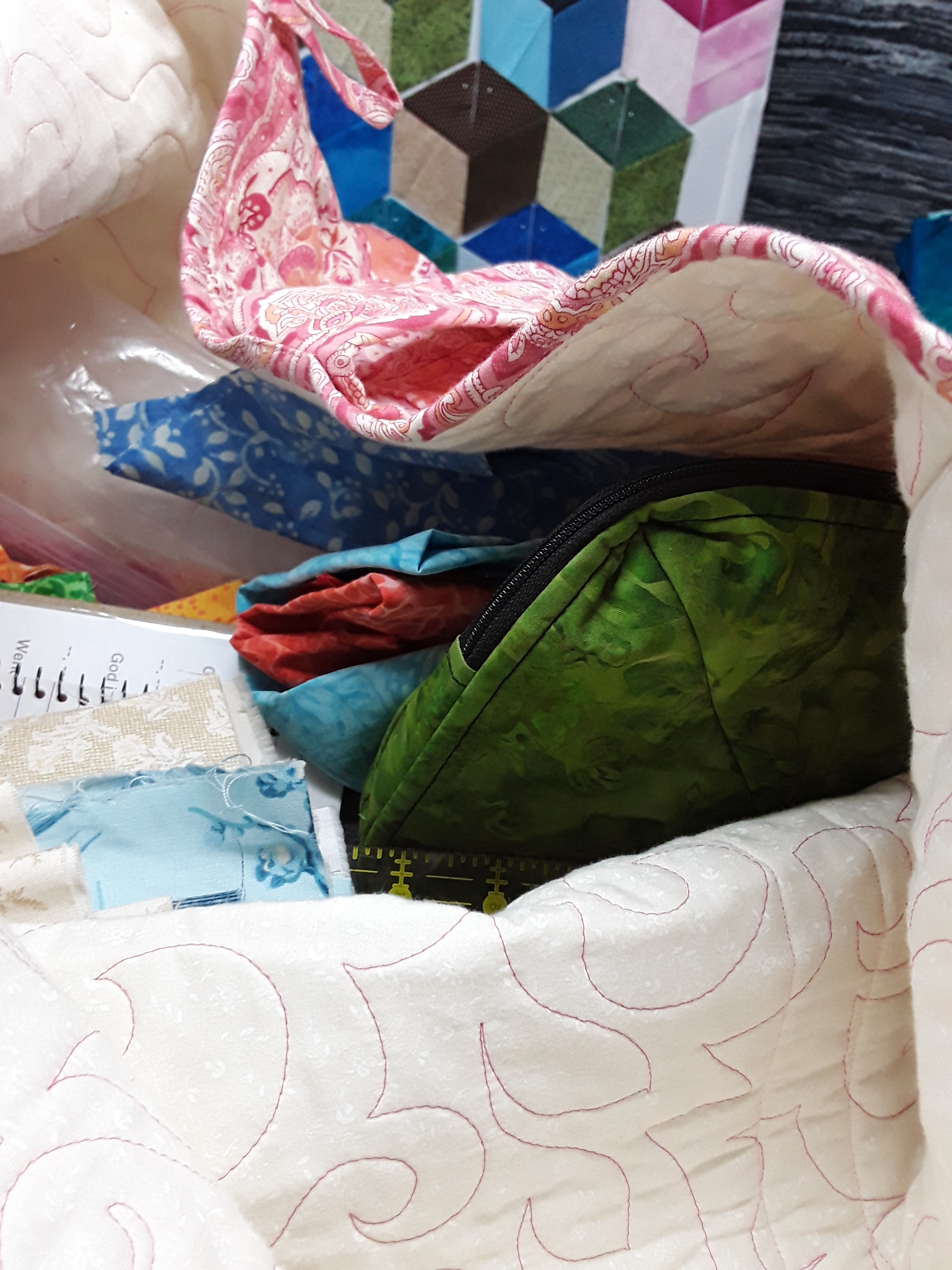 First, I always take my “Flat Mat Bag” (pattern is available on my website). It holds my 18″ x 24″ mat and 24″ ruler and a lot more, including my Go Bag of notions. I usually have more things than I need, but better to have them, just in case. A look inside of what I usually carry…