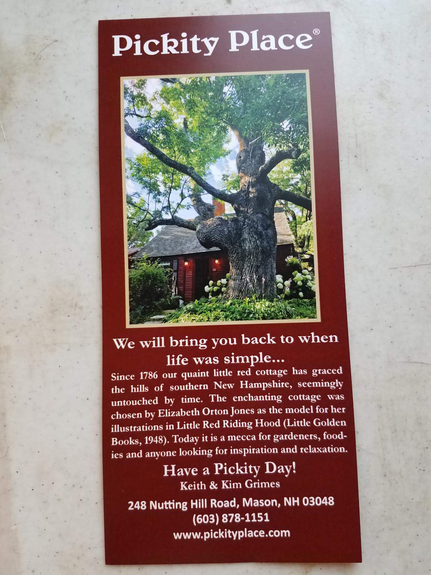 What do you do with your quilting friends on a cold day when it is visit your local quilt shop day? …..WELL… First, we went to Pickity Place in Mason, NH. This little red house/cottage was built in 1786 and was the inspiration for Elizabeth Orton Jones’ illustrations for the Little Golden Books 1948 “Little Red Riding Hood”!! How cool is that?! They have daily luncheon seatings and have a set menu that changes every month. Talk about GOOD!! The food is amazing and the atmosphere so sweet! Below is the flyer about Pickity Place. Reservations recommended.