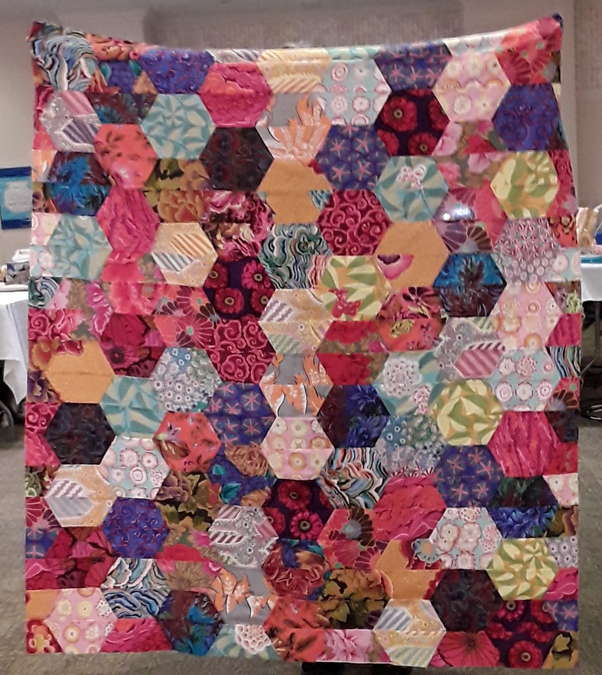 Several student’s quilts from the Hex-a-ma-jig workshop about a month ago showed up at the Getaway. Another super job by Kathleen L. and her Hexie quilt is DONE! I love how the brights sing!