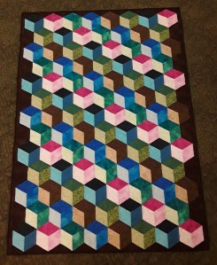 I attended a Getaway this past weekend. I love the chance to work on projects with like minded people. First up, the binding on my lap size Baby Blocks quilt. I showed the quilt previously asking for border opinions. The final decision was to add a little border of the surrounding brown fabric and be done. It didn’t need anymore and since I was out of the brown fabric, decision made! (Note: it is laying on a brownish carpet, only a small brown border was added.)