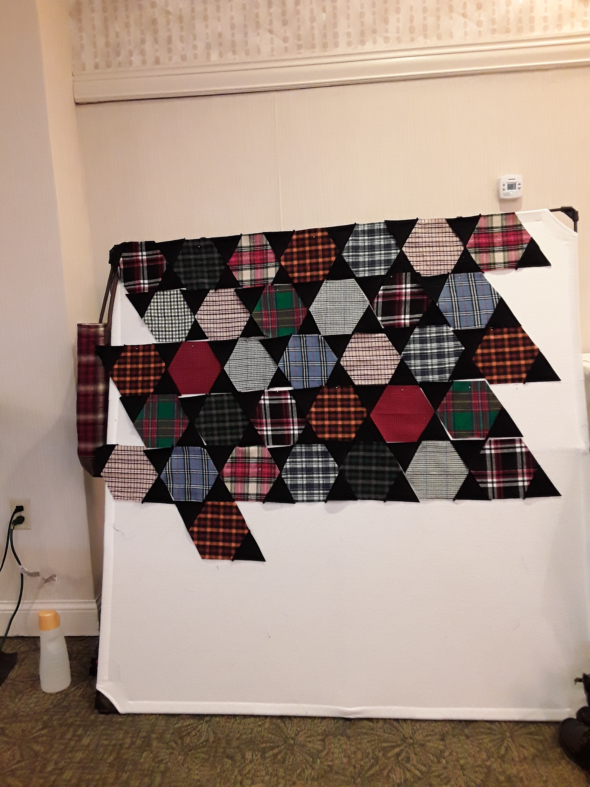 Here is a start Priscilla’s flannel version using full hexies and triangles. LOVE those plaid flannels! This design really shows off the fabrics. I also love how she used the black at the edges to float the hexies. She borrowed the use of my portable design wall<grin>. Bonus idea…the repurposed creamer bottle on the floor was used for water for the iron!
