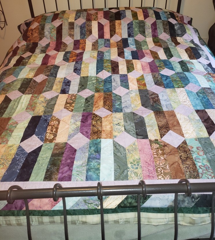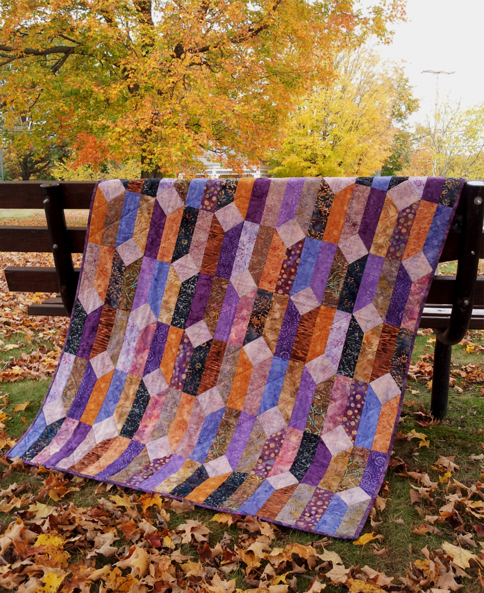 Today I want to share one of my quilt patterns and how coloring can change the look. Diamond Tipped Tools was designed using Brilliant Bindings. The cover quilt has some yummy “fall type” coloring with purples/golds/rusts made by my friend Priscilla.