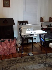 I love the portable table by “SewEzi”. It is easy to set up and has a great flat surface with the custom made insert for the bed of the machine. My sleek “Daylight” portable light is wonderful for these ‘ol eyes! It can be bent and aimed to light up just the right spot. I have the “Slimline” version by the Daylight Company.
