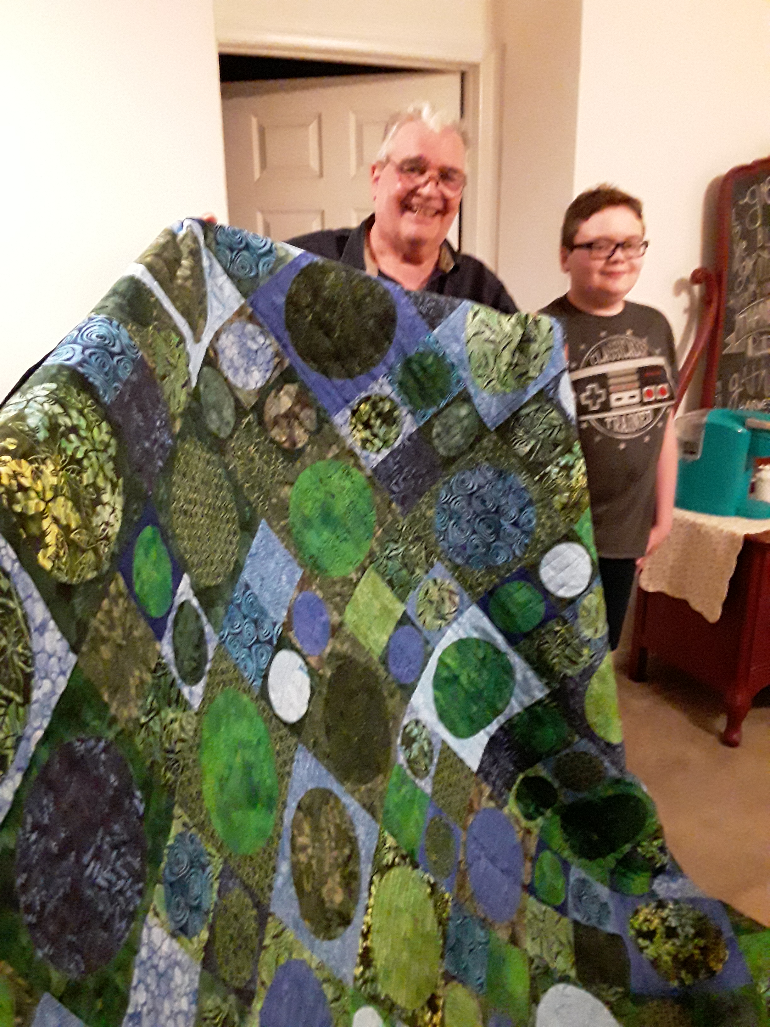I love how it turned out! And here is a picture of Grandpa and grandson with his quilt. He loves it! I look forward to seeing it on his bed before we leave. YES, I’m still hand sewing the binding! Some things take more time!!