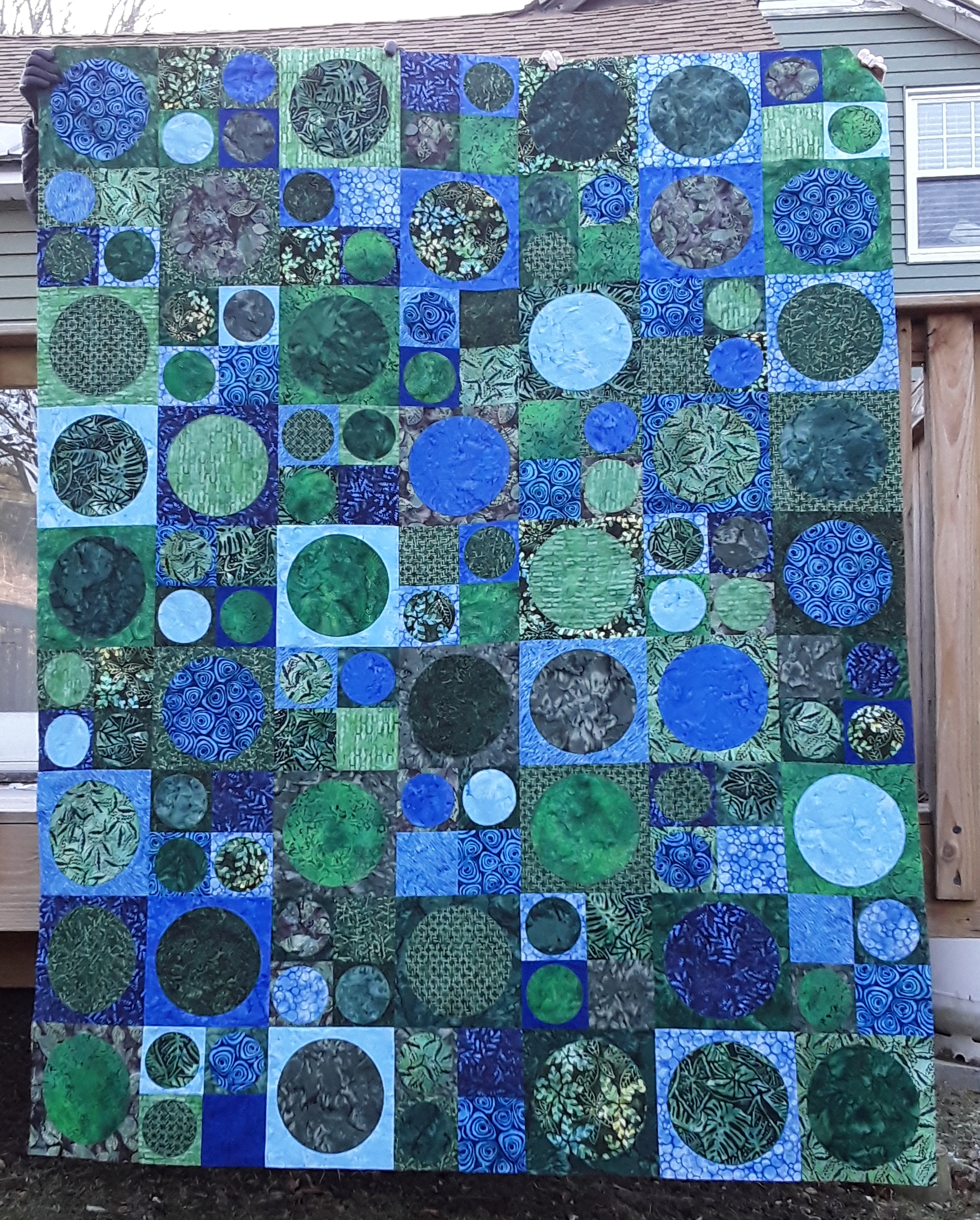 On another subject of coloring, below is our grandson’s quilt. He chose the colors he wanted and idea of circles (I picked all the fabrics and changed up the idea of two different size circles.)