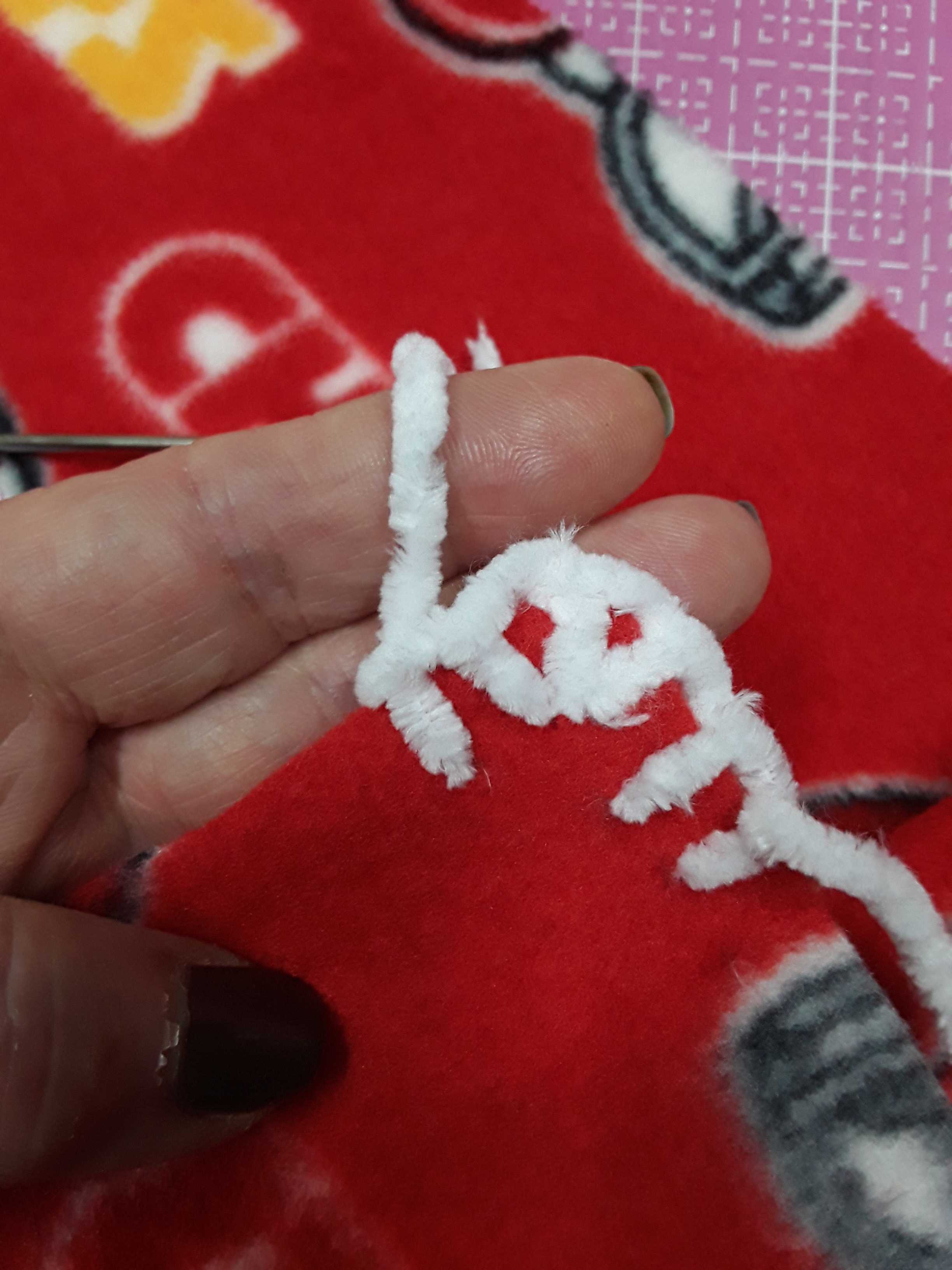 I measured 3/8″ in from the edge and cut with the perforating blade. This will make the holes about the same distance from the edge as they are apart. I will not turnover the edge as I did on the last one. (I could, but find it not necessary as the fleece will not fray.) I put the needle through a few holes so you can see how the blade cut through the fleece. I made sure I stopped cutting right at the 3/8″ corner, so the corner stitching would be EVEN!